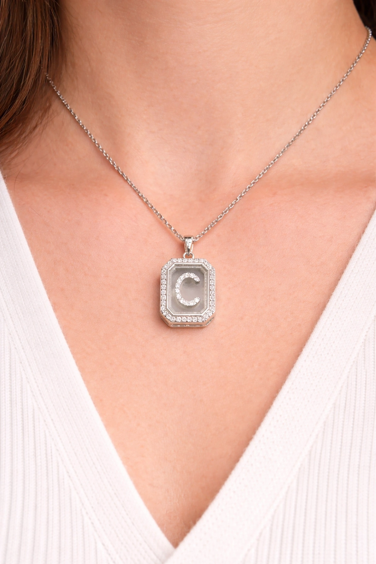Gümüş Renk C Harf Taş Detaylı Çelik Kolye