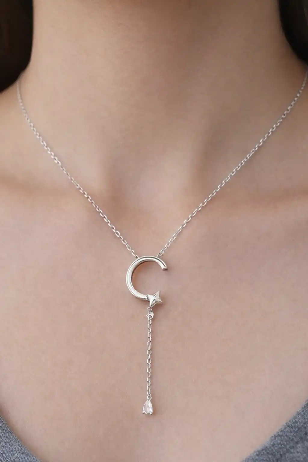 Gümüş Renk C Harfli Taş Detaylı Çelik Kolye