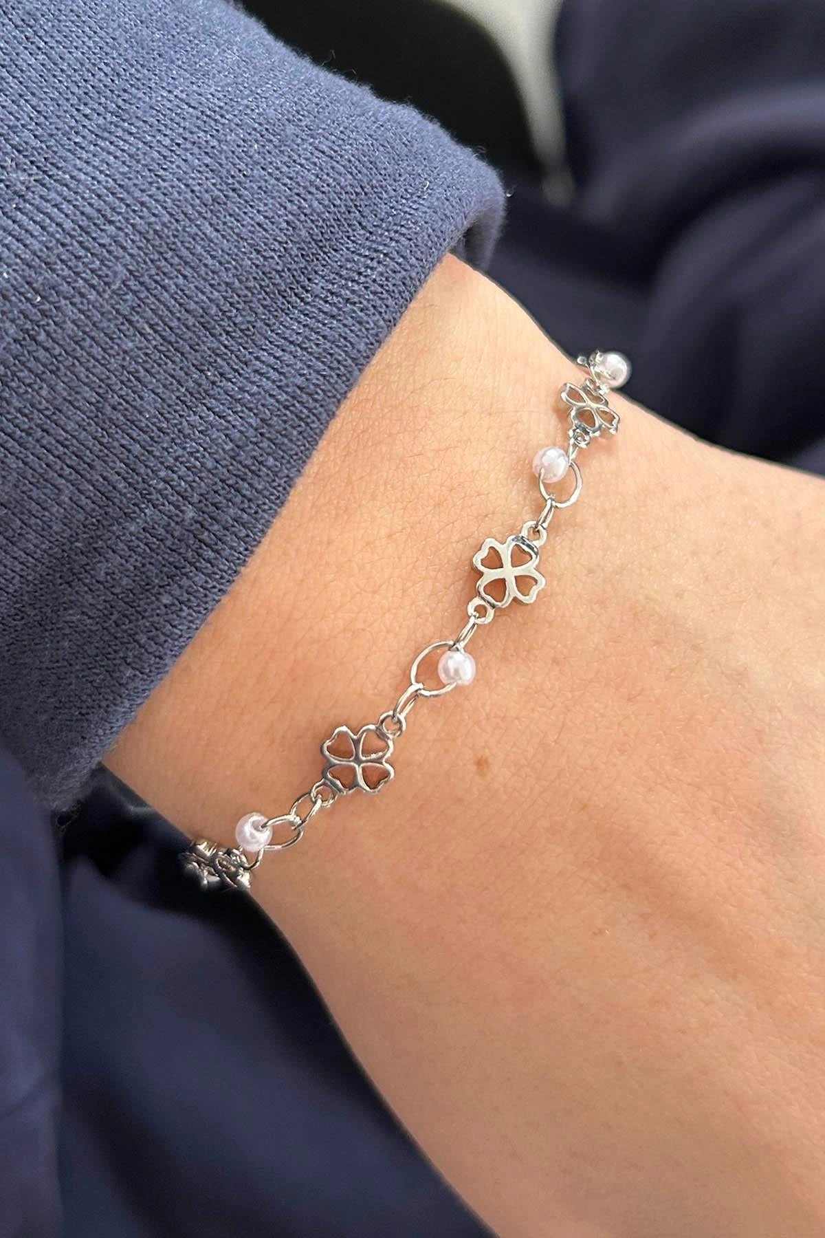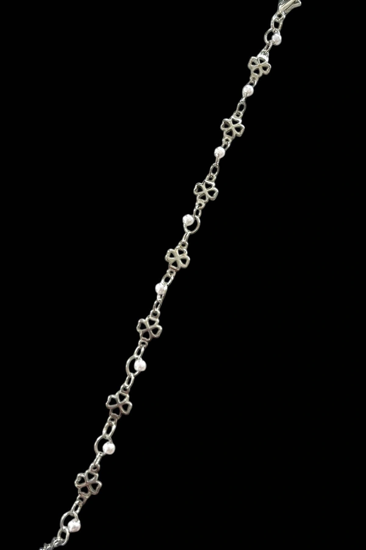 Gümüş Renk Çiçek Figürlü İnci Detaylı Bileklik