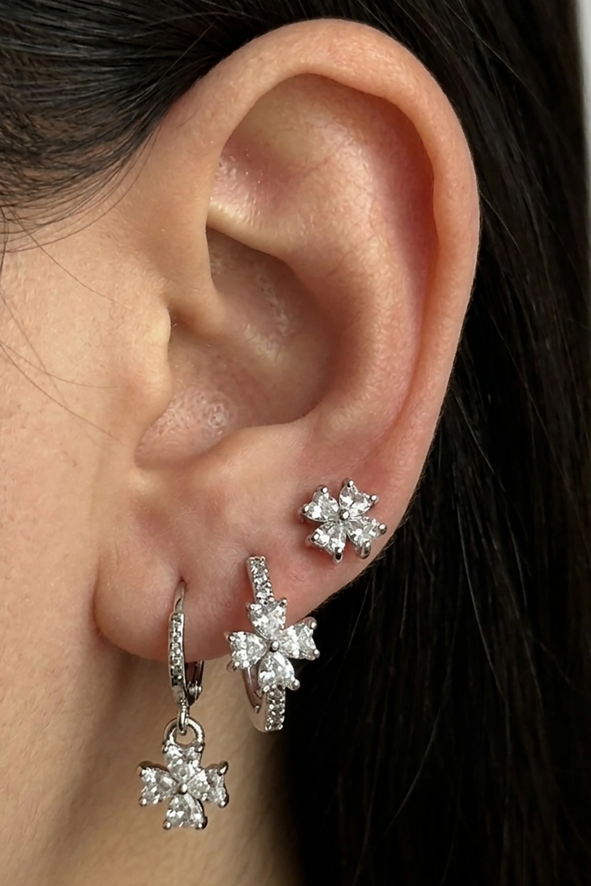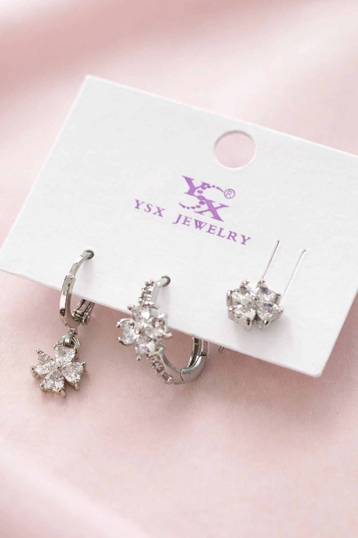 Gümüş Renk Çiçek Figürlü Taş Detaylı 3'lü YSX Küpe