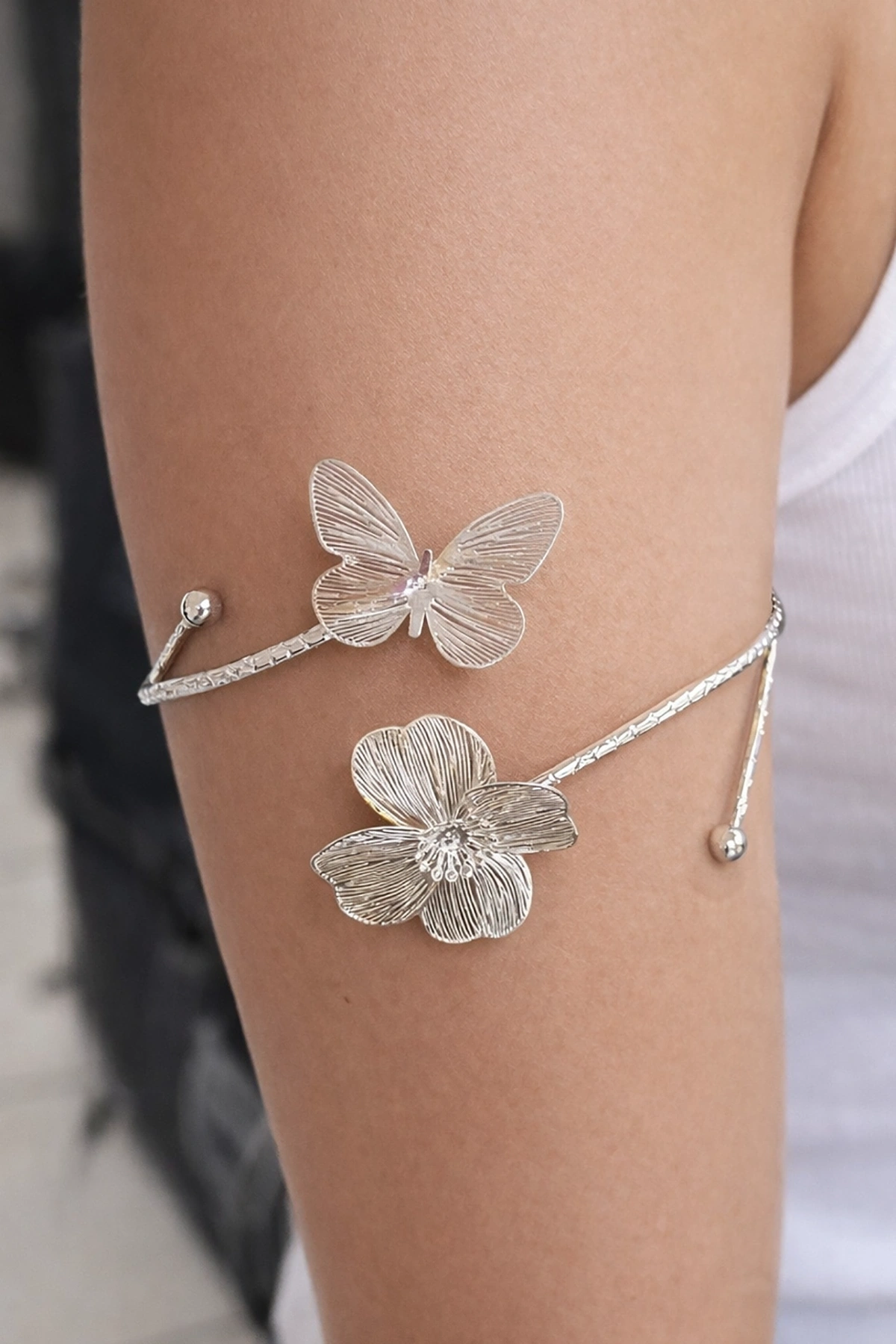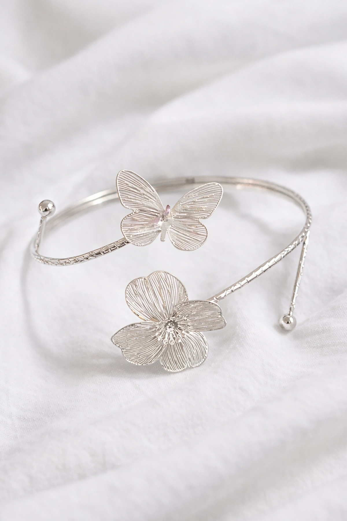 Gümüş Renk Çiçek Ve Kelebek Figürlü Tasarım Bileklik Kol Aksesuarı
