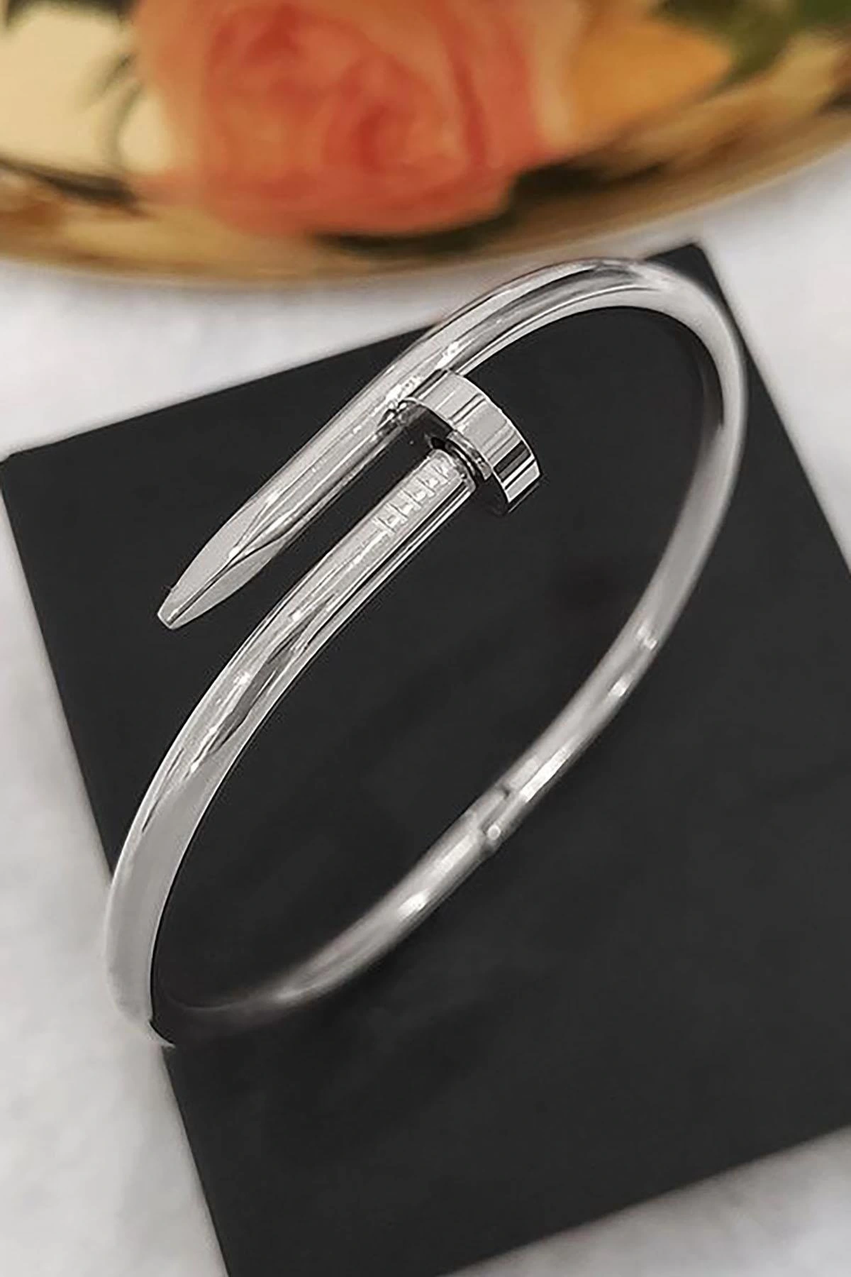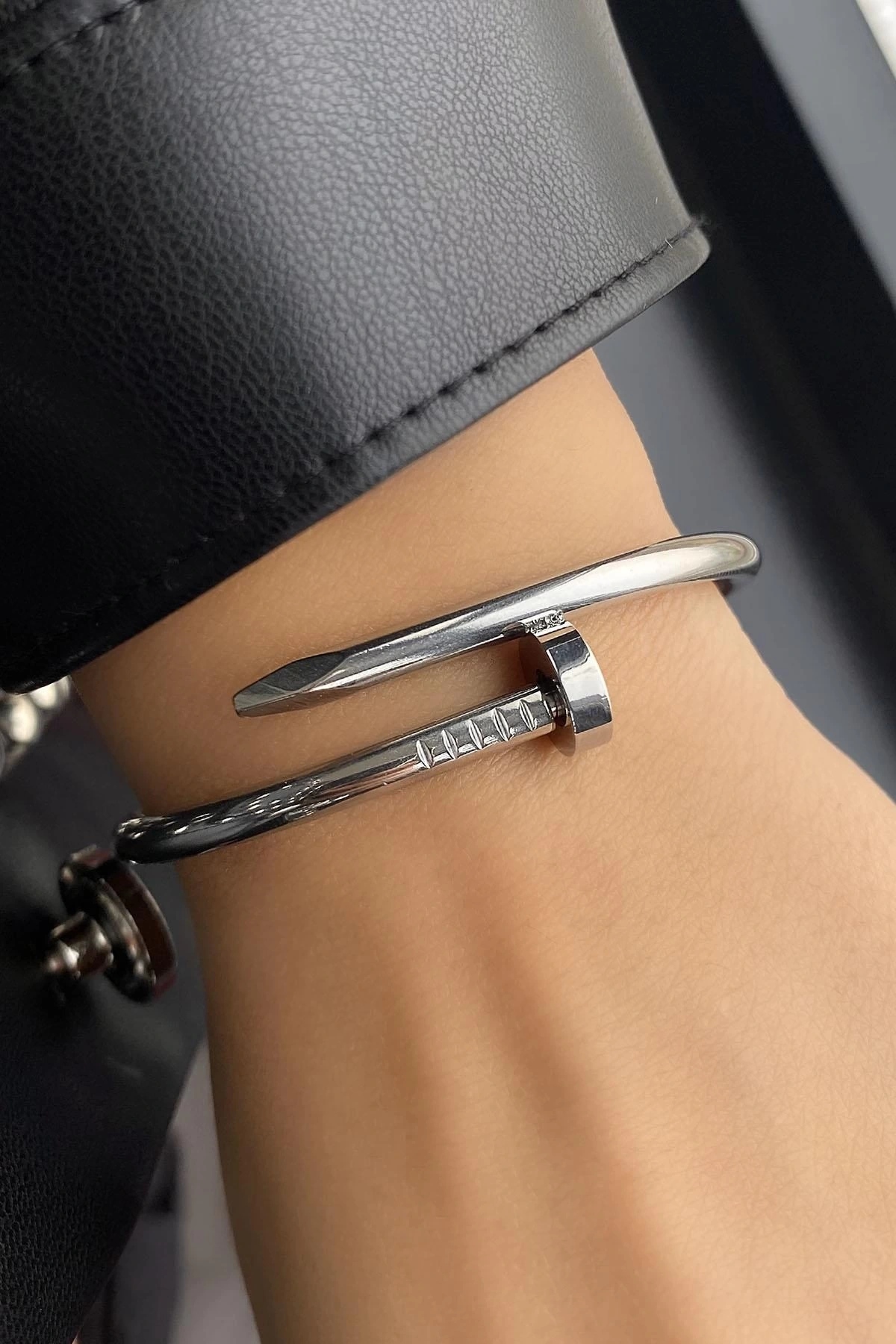 Gümüş Renk Çivi Detaylı Çelik Kelepçe Bileklik