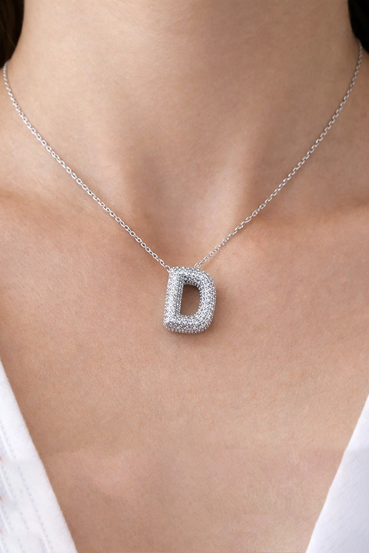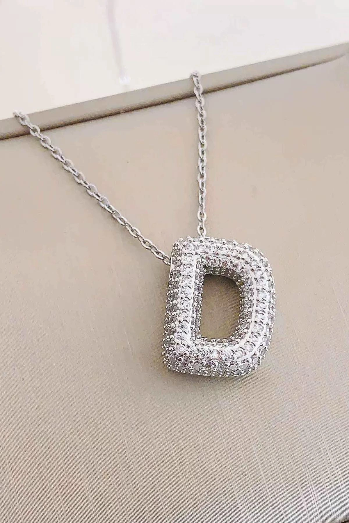 Gümüş Renk D Harf Taş Detaylı Çelik Kolye