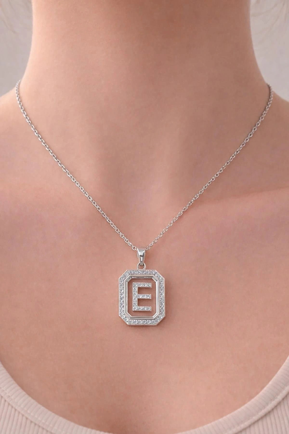 Gümüş Renk E Harf Taş Detaylı Çelik Kolye