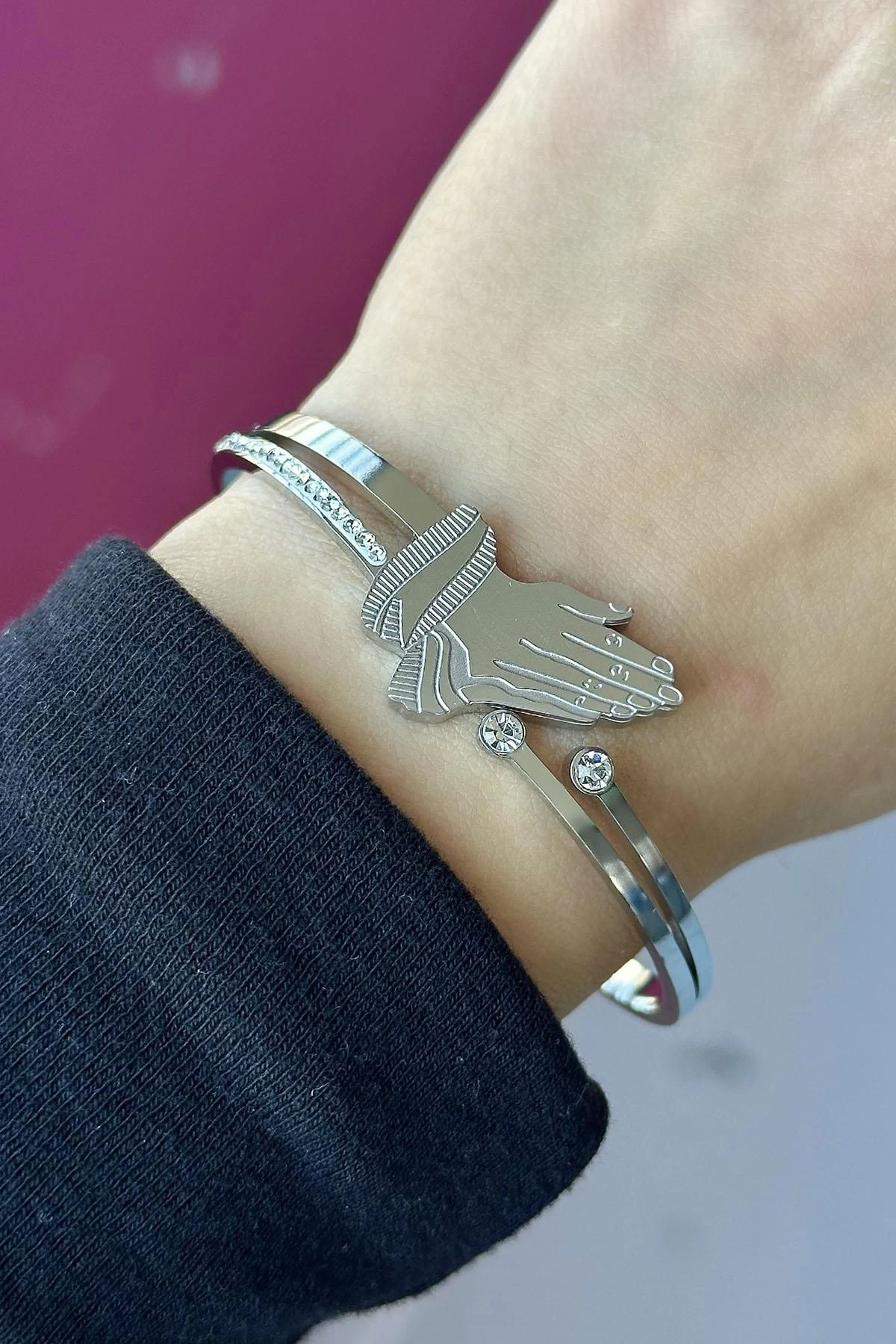 Gümüş Renk El Figürlü Taş Detaylı Çelik Kelepçe Bileklik