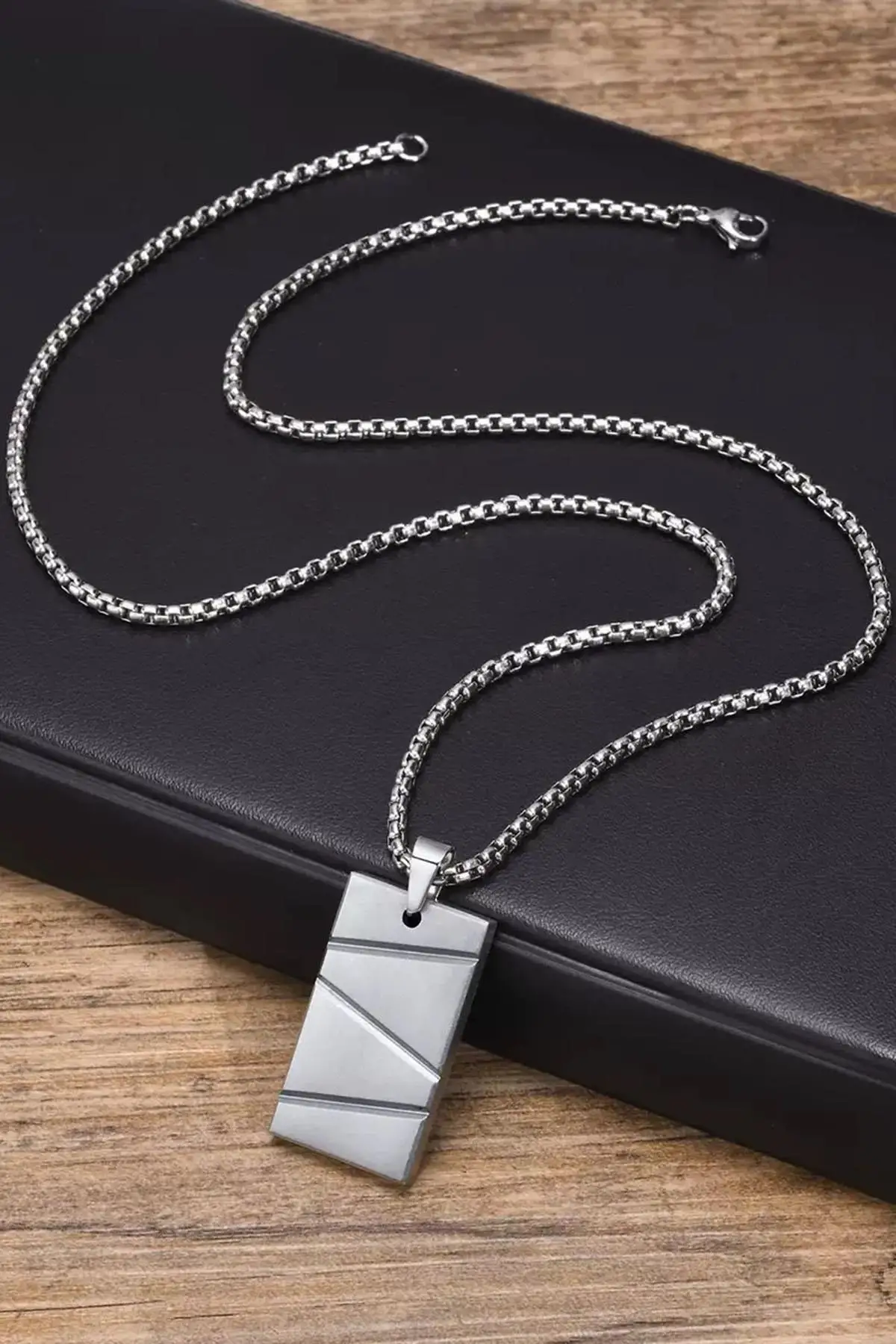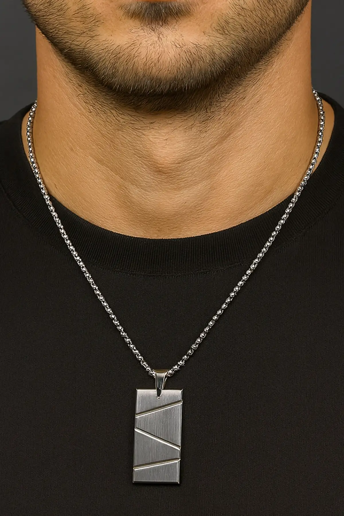 Gümüş Renk Zincir Detaylı Unisex Çelik Kolye