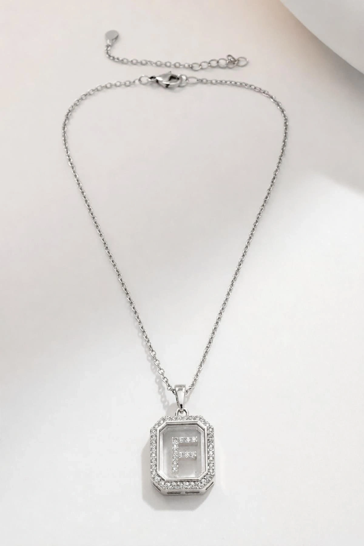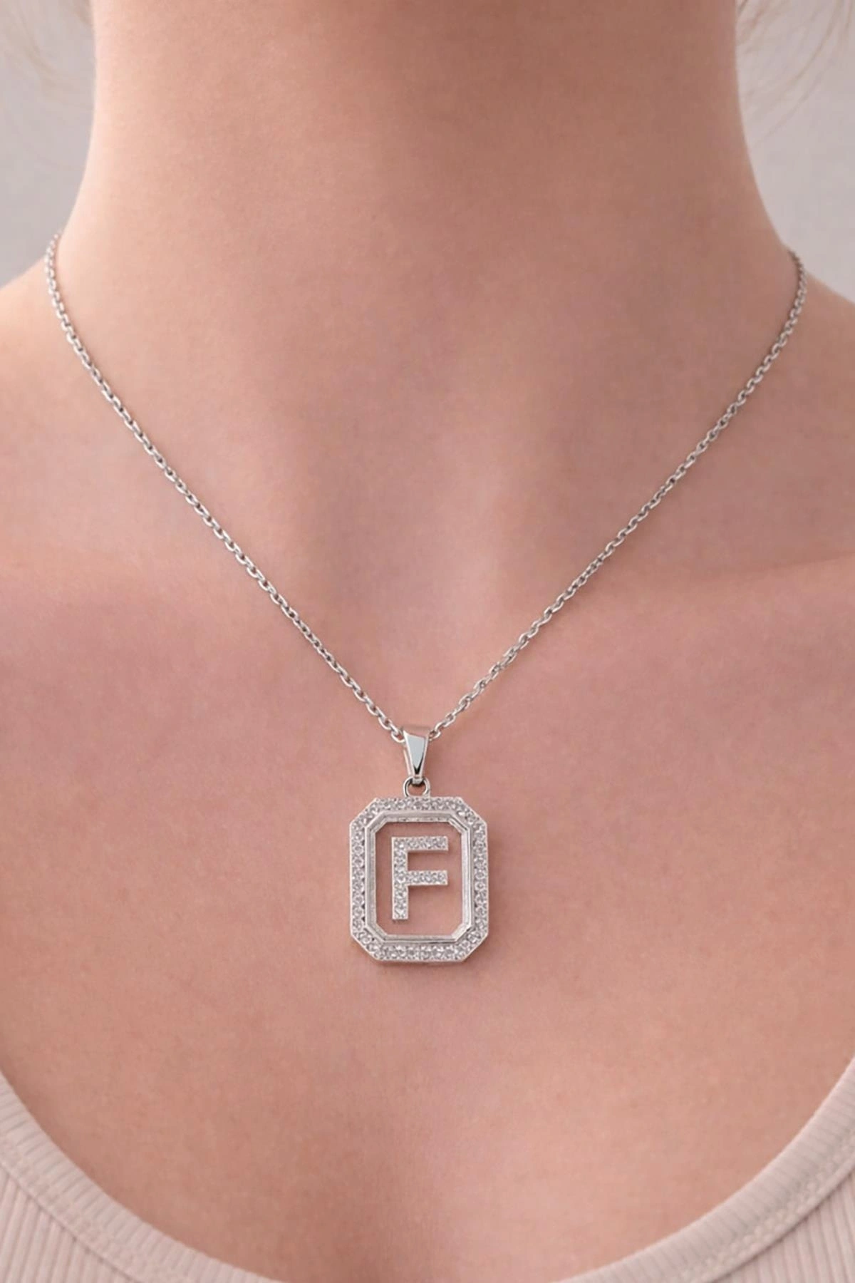 Gümüş Renk F Harf Taş Detaylı Çelik Kolye