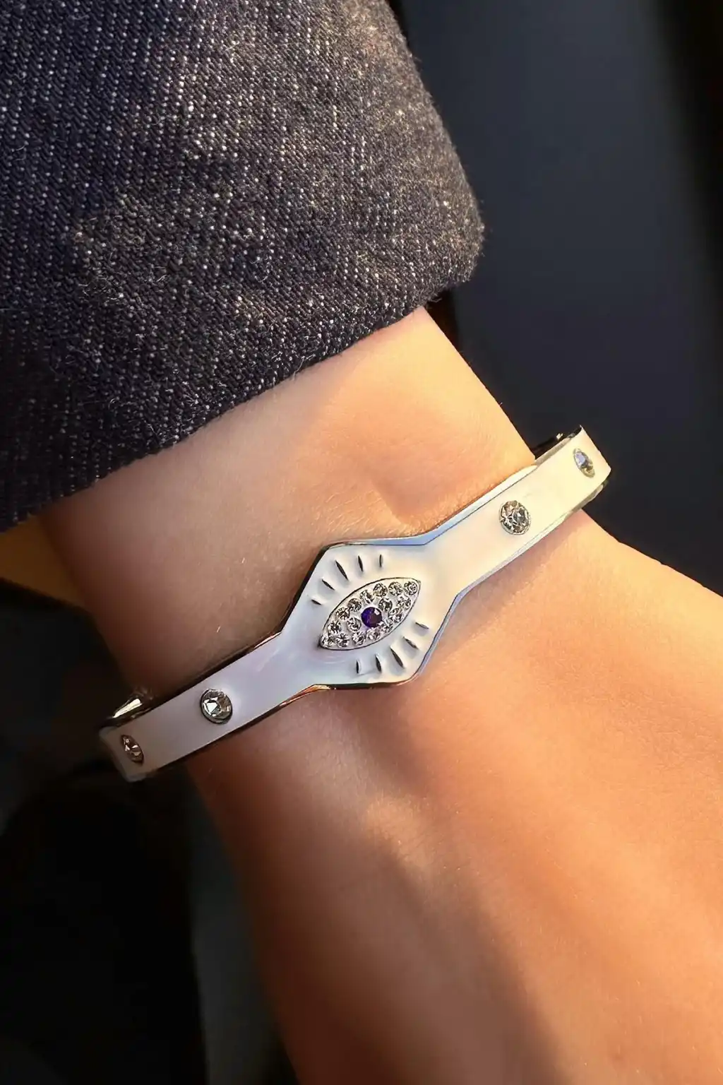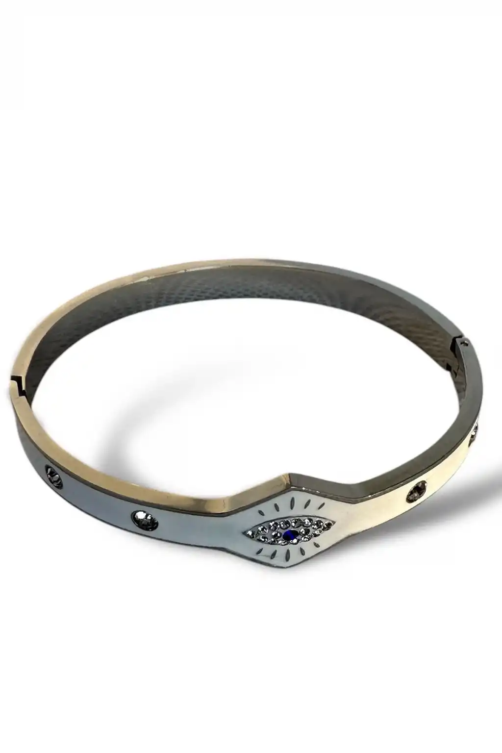 Gümüş Renk Göz Figürlü Taş Detaylı Çelik Kelepçe Bileklik