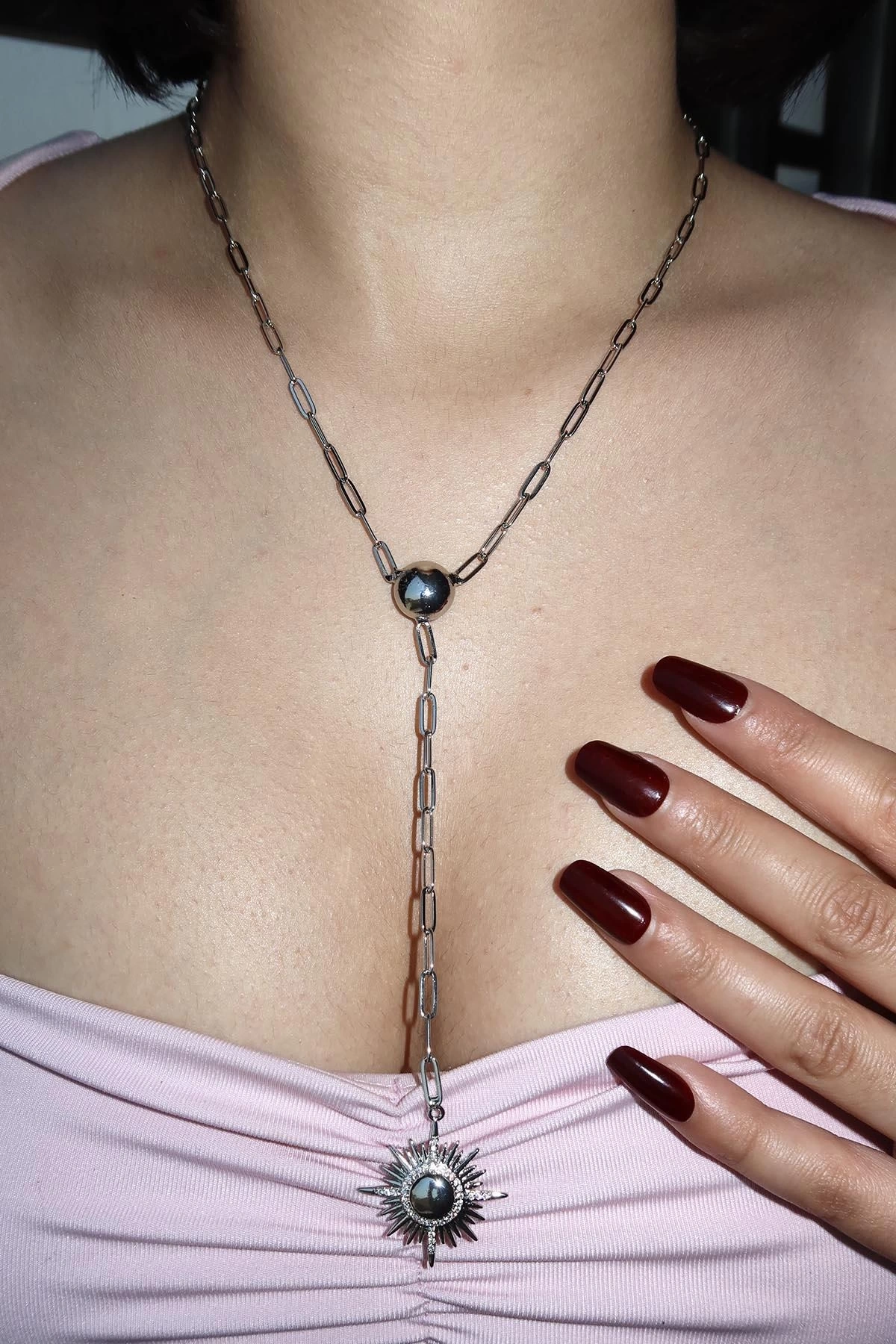 Gümüş Renk Güneş Figürlü Taş Detaylı Y Kolye