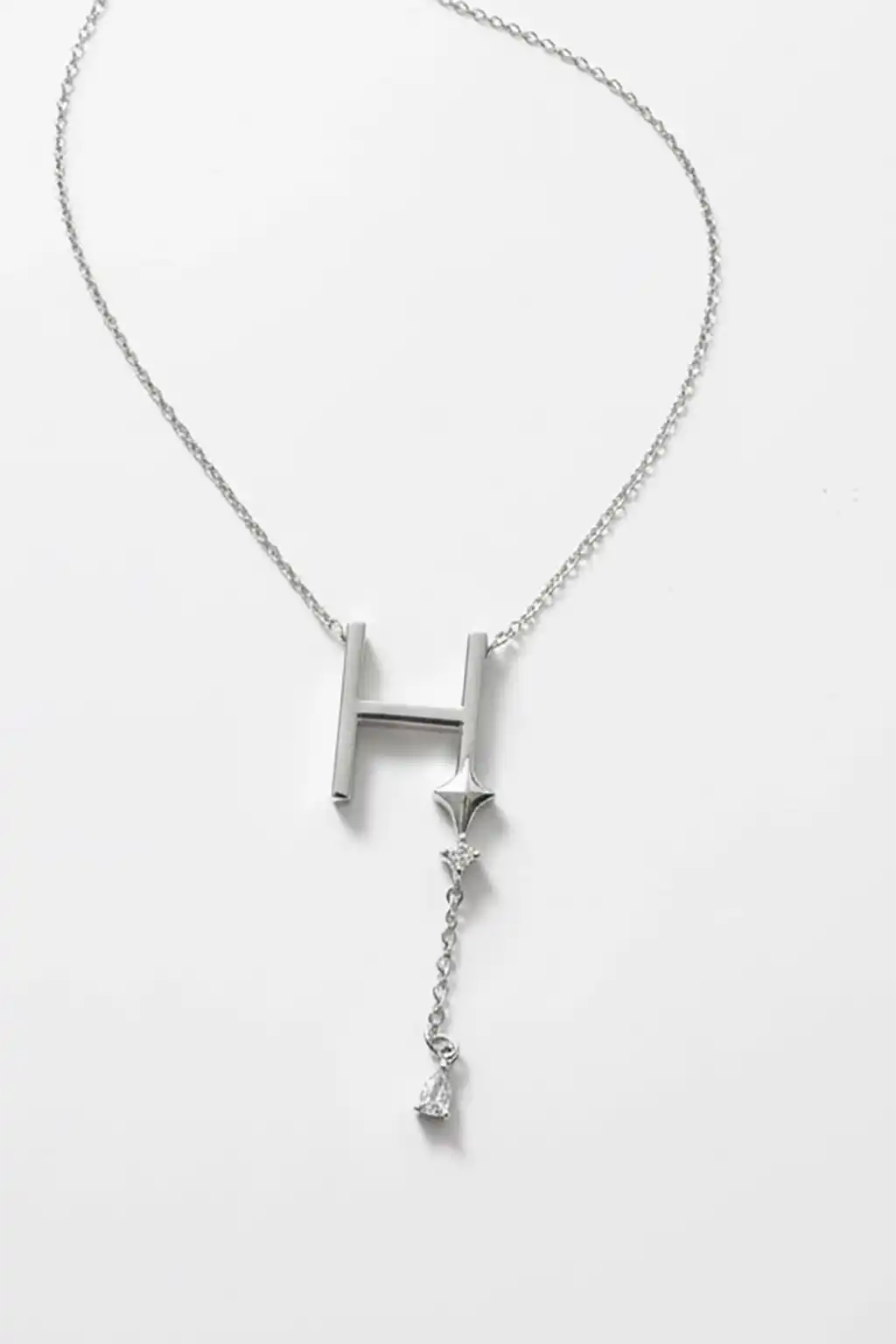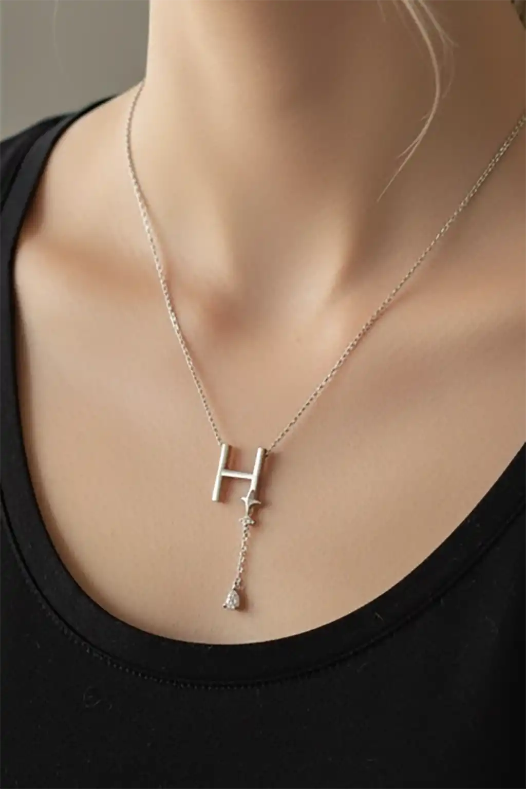 Gümüş Renk H Harfli Taş Detaylı Çelik Kolye