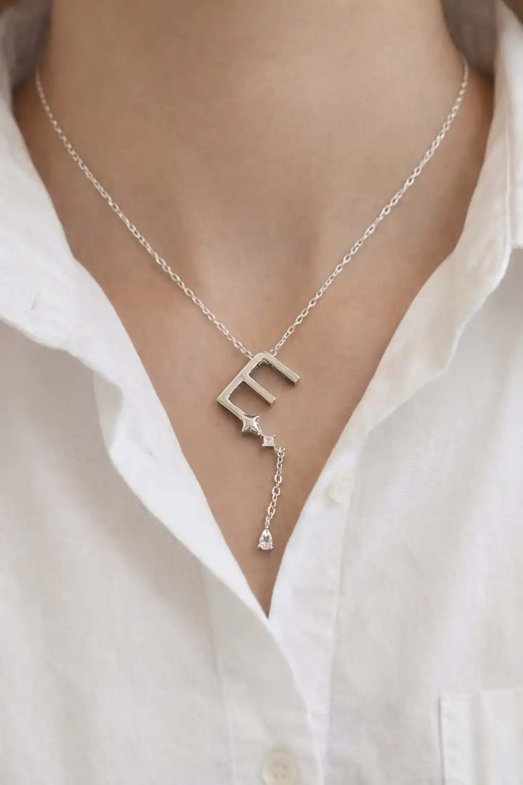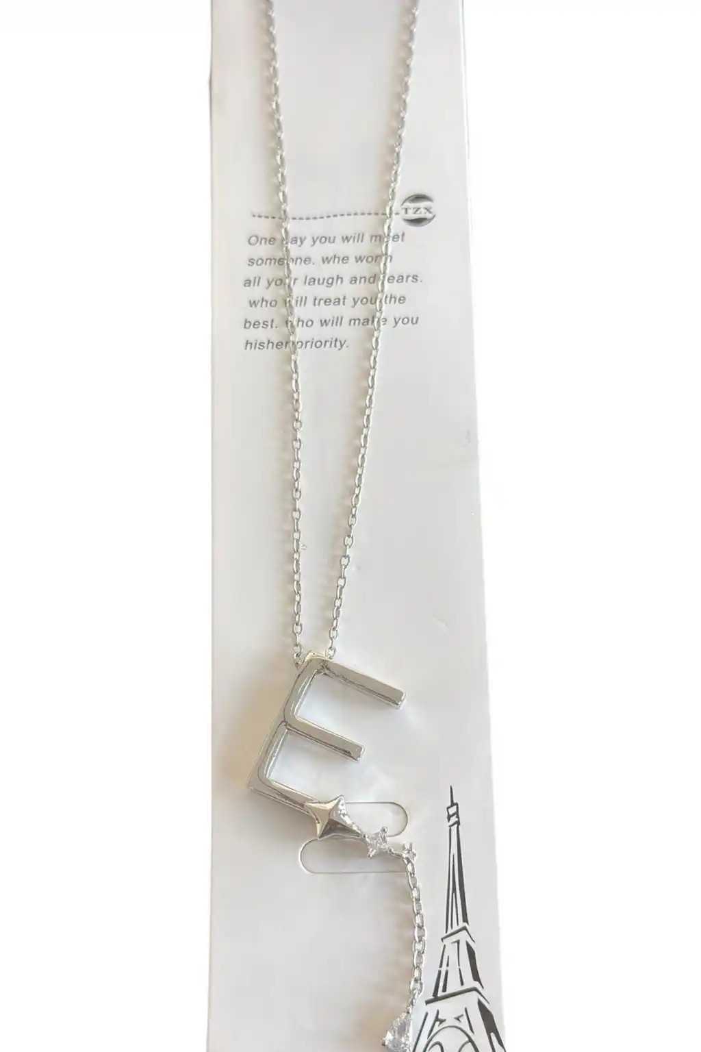 Gümüş Renk Harfli E Taş Detaylı Çelik Kolye