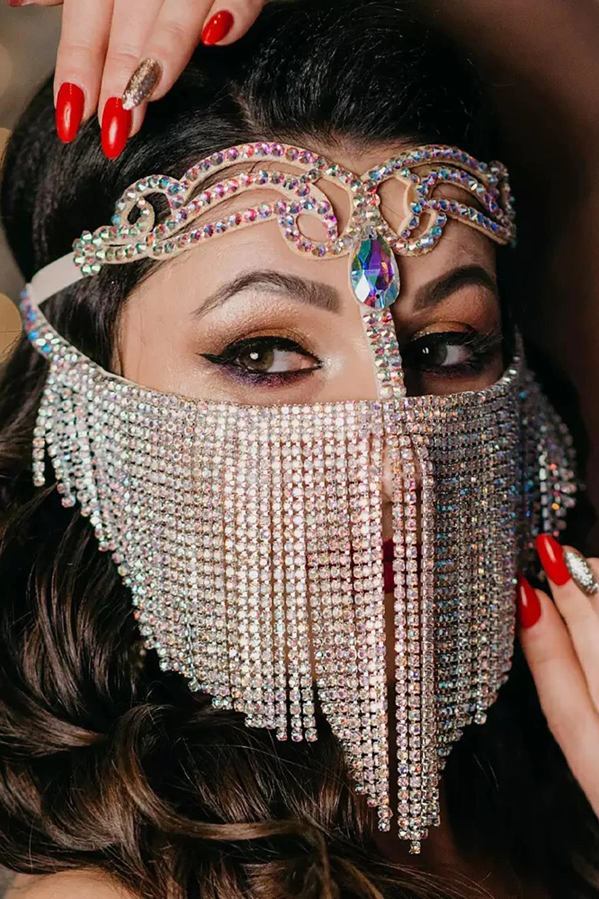 Gizem, zarafet ve ihtişamın buluştuğu bu özel dansöz maskesi, sahnede tüm bakışları üzerinize çekmek için tasarlandı. İnce işçilikle hazırlanmış gümüş renkli zincir detayları, yüz hatlarını zarifçe vurgularken oryantal dansın büyülü atmosferini kusursuz şekilde yansıtır.