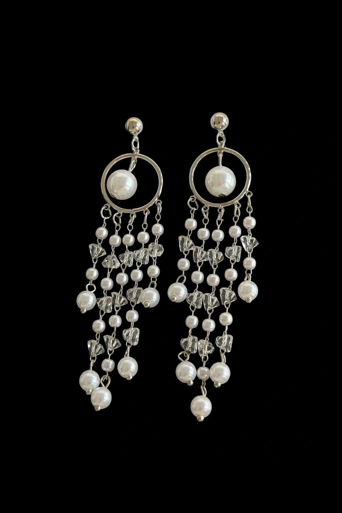 Gümüş Renk İnci Detaylı Sallantılı Küpe (Çift)