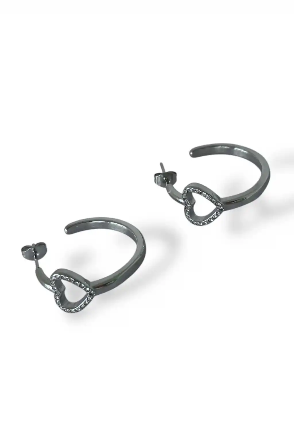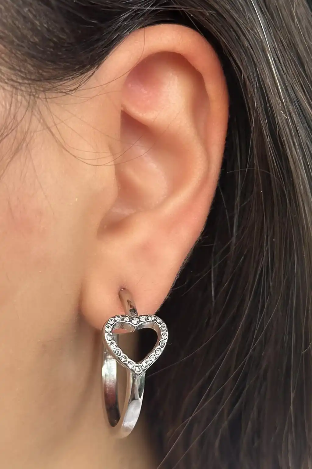 Gümüş Renk Kalp Detaylı Çelik Halka Küpe (Çift)