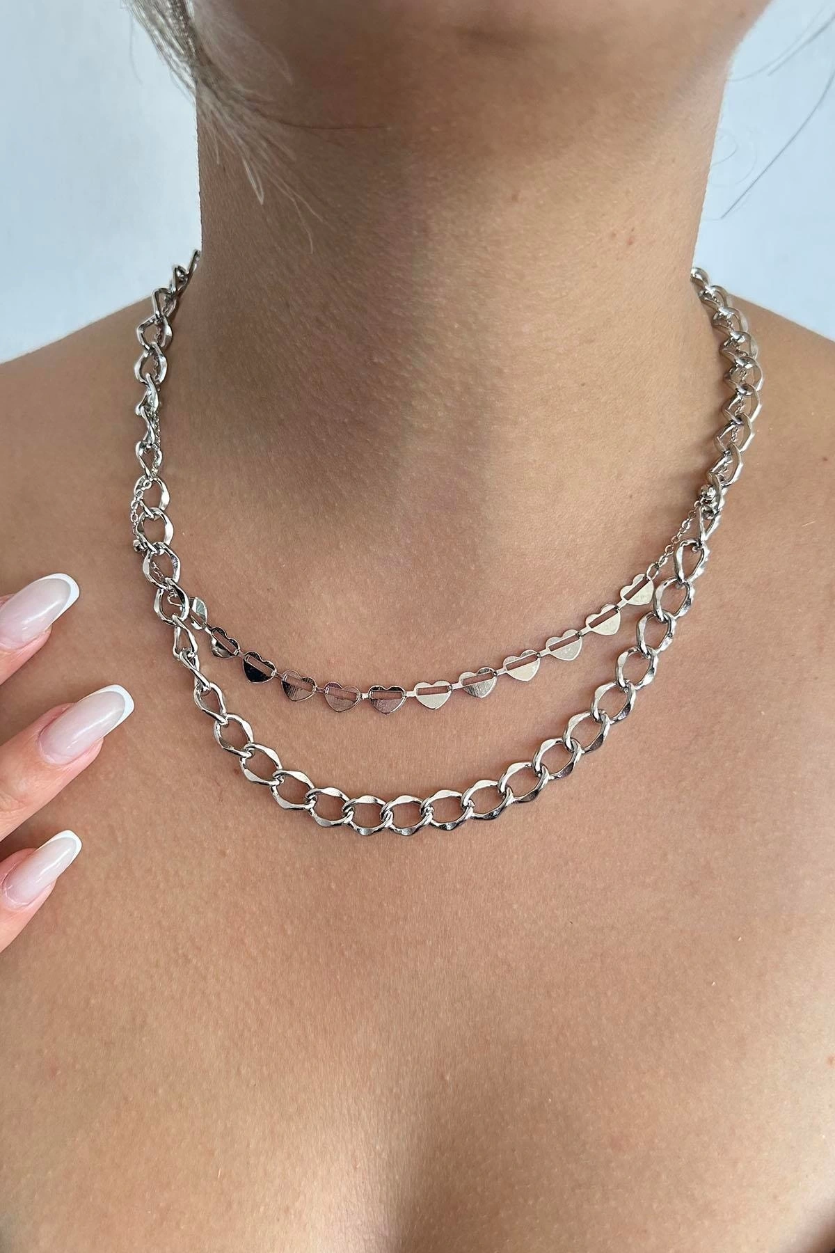 Gümüş Renk Kalp Figürlü İkili Kolye
