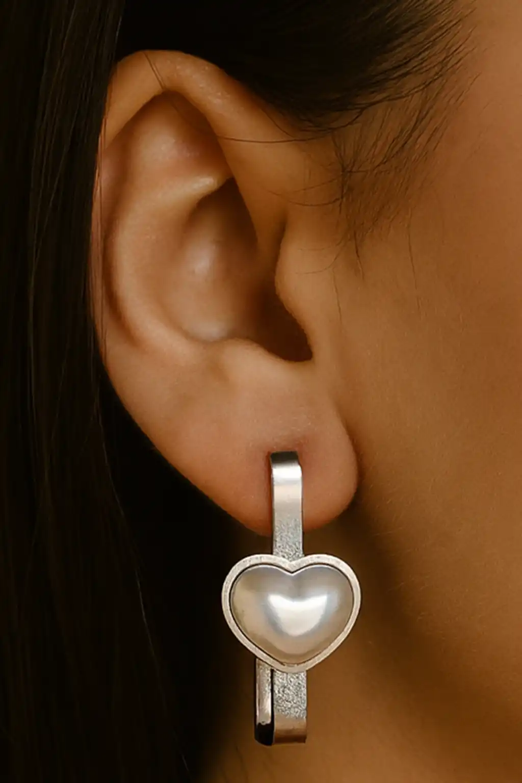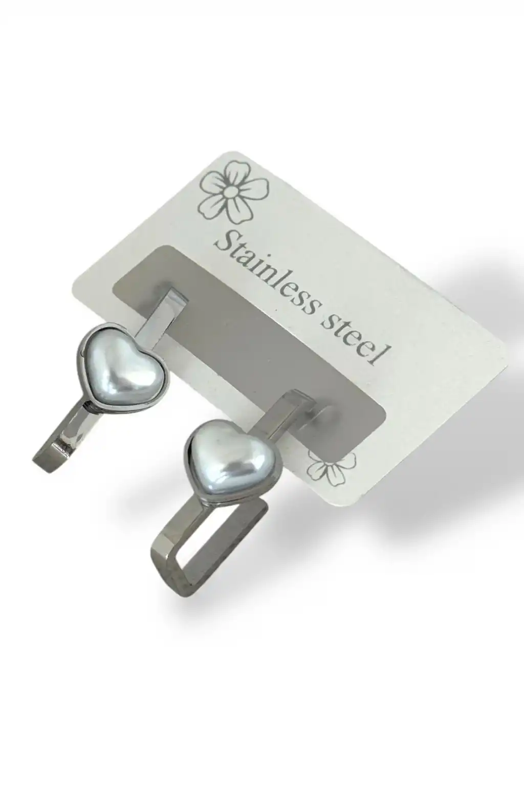 Gümüş Renk Kalp Figürlü İnci Detaylı Çelik Küpe (Çift)
