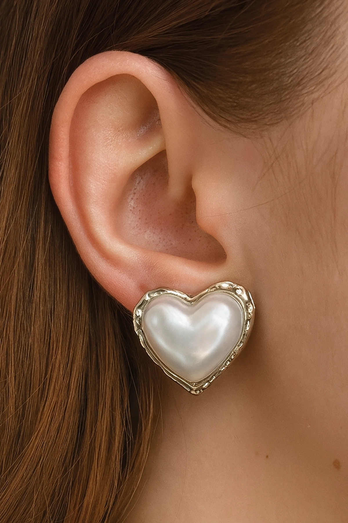 Gümüş Renk Kalp Figürlü İnci Detaylı Küpe (Çift)