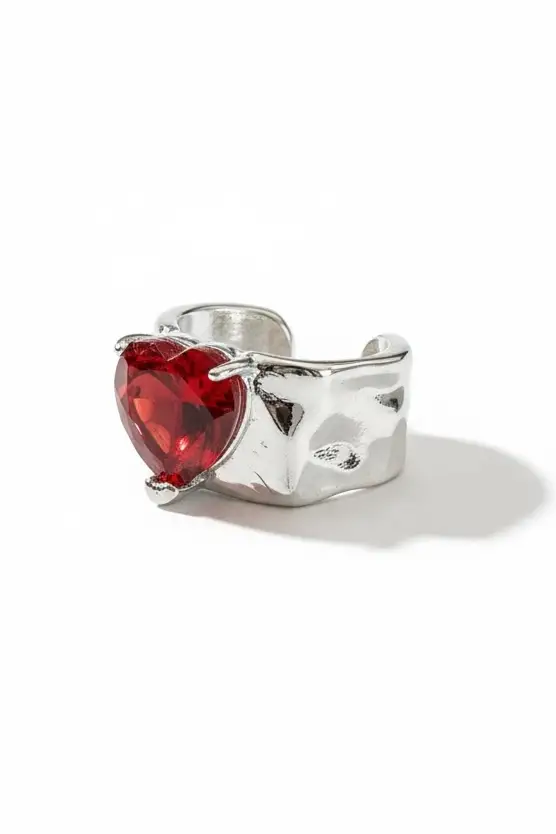 Gümüş Renk Kalp Figürlü Kırmızı Taş Detaylı 14K Altın Kaplama Ear Cuff (Tek)