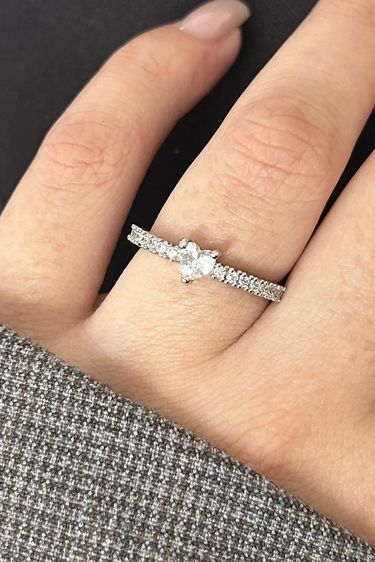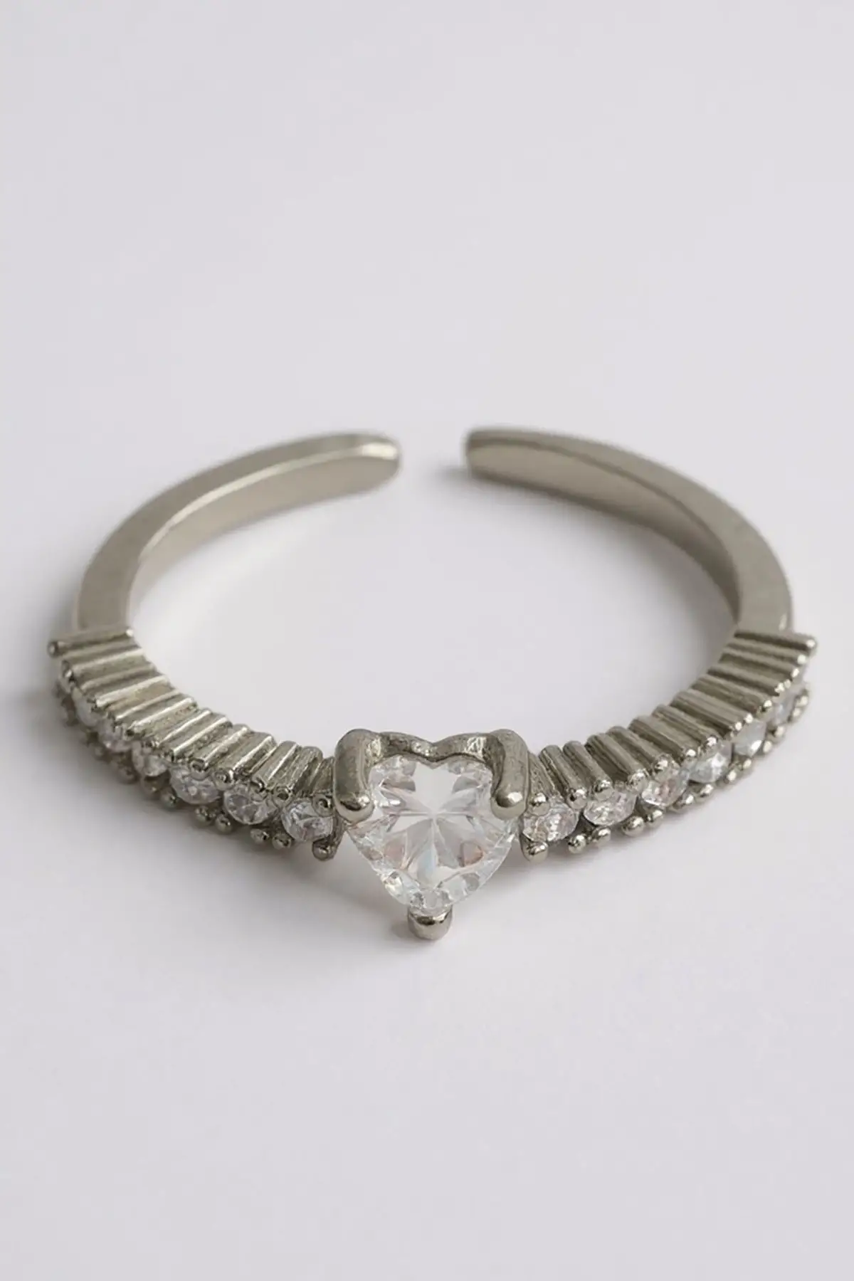 Gümüş Renk Kalp Figürlü Taş Detaylı Ayarlanabilir Yüzük
