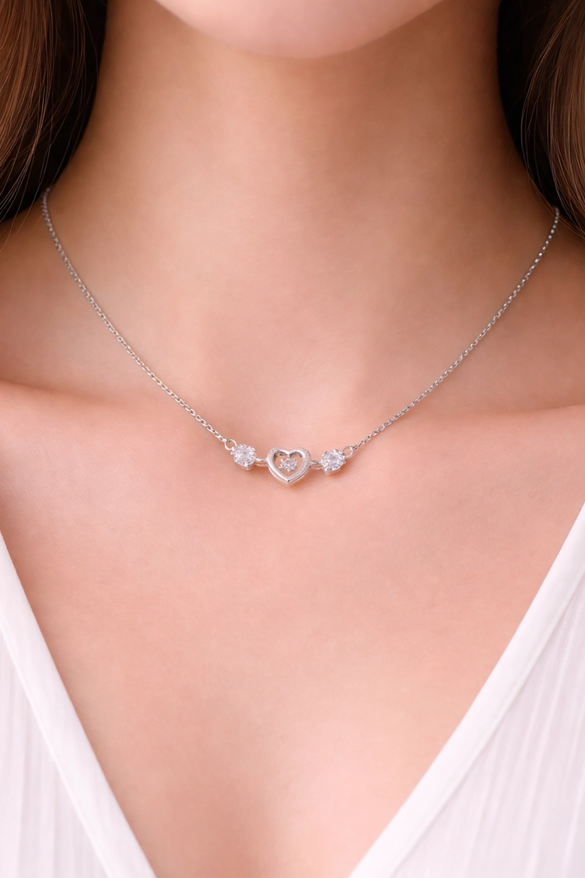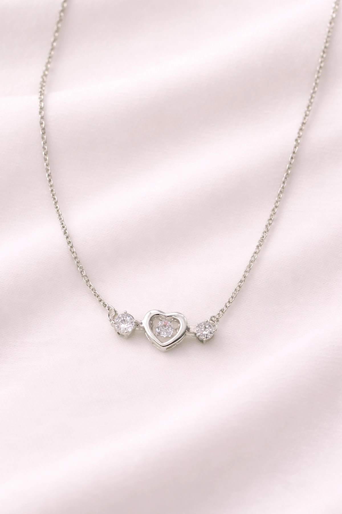 Gümüş Renk Kalp Figürlü Taş Detaylı Çelik Kolye