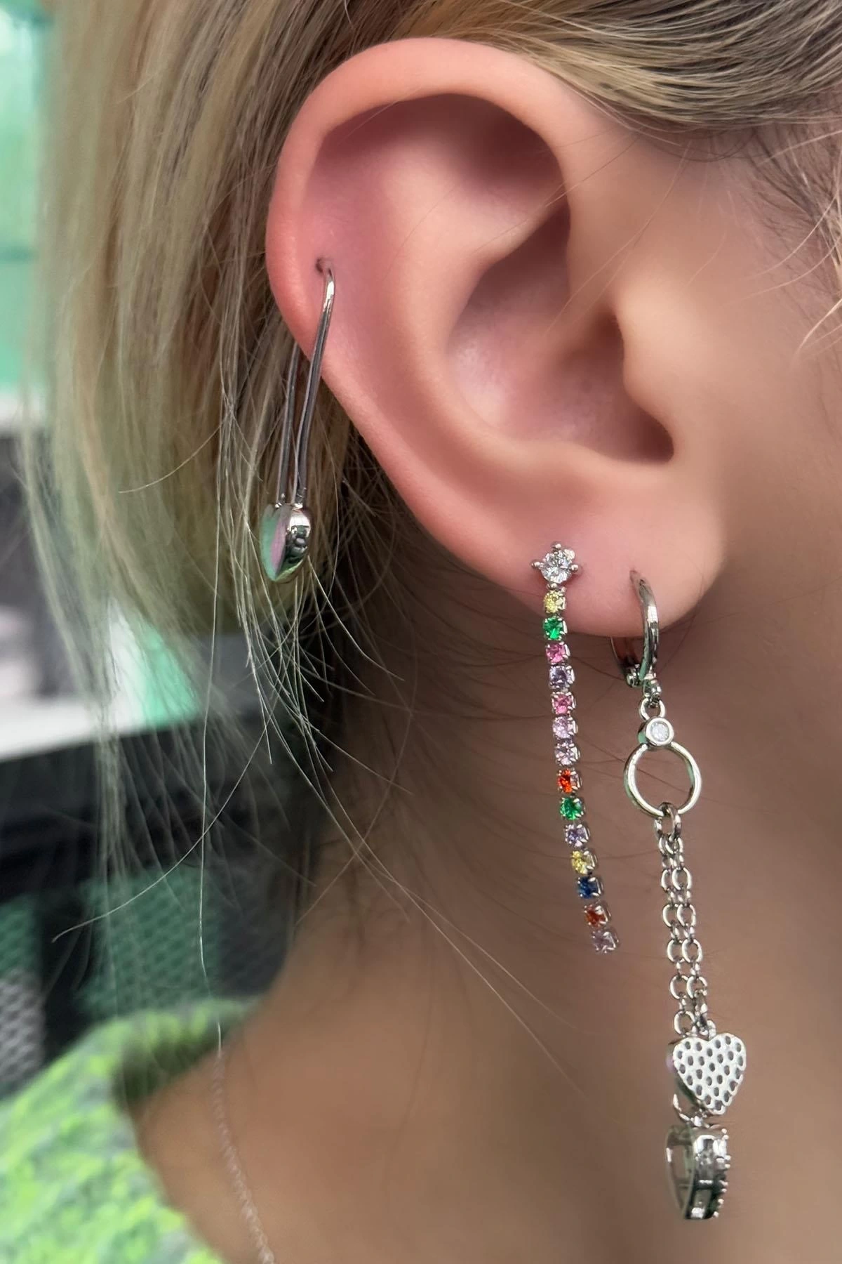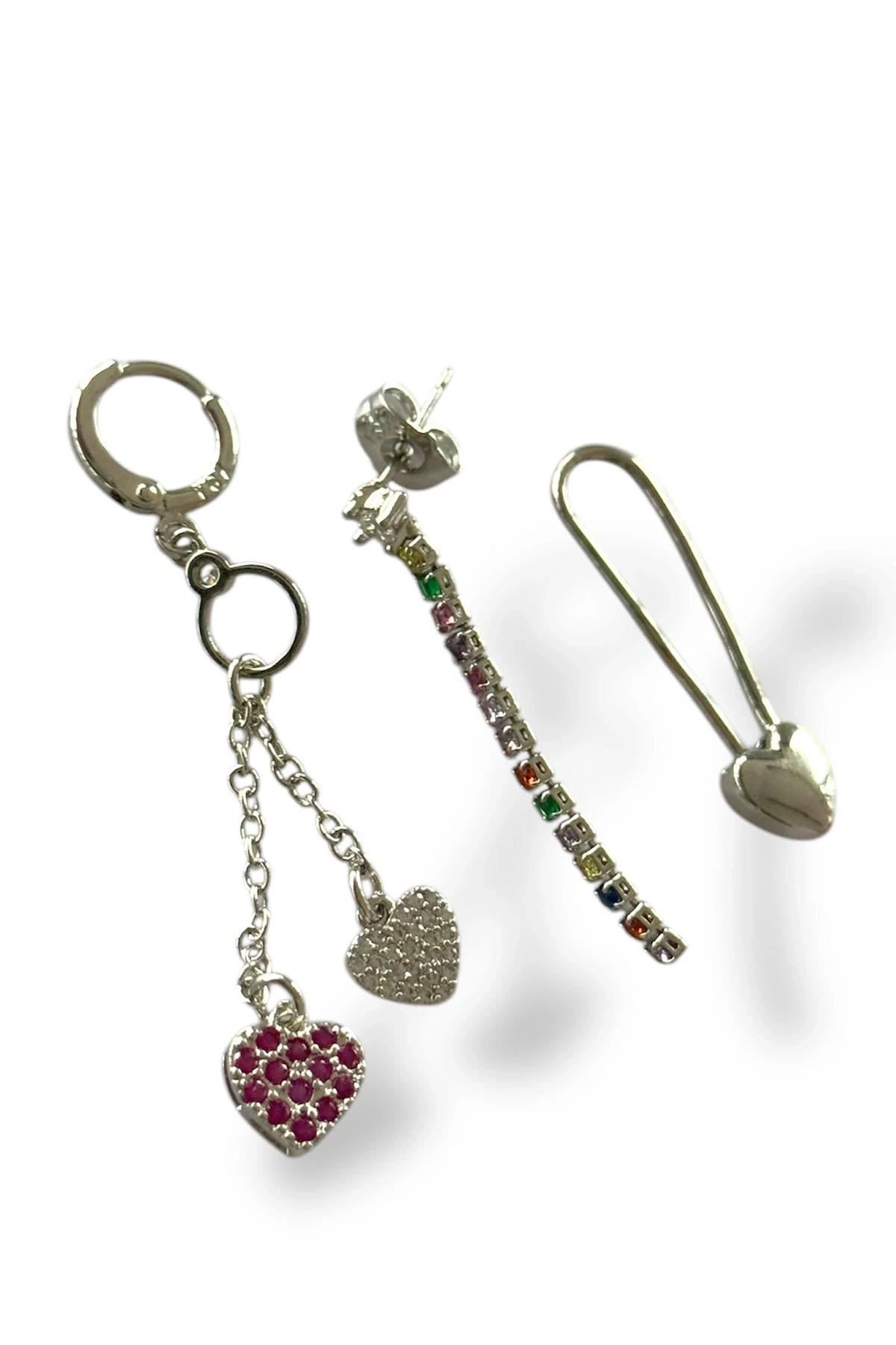 Gümüş Renk Kalp Figürlü Taş Detaylı VİP 3'lü YSX Küpe Set