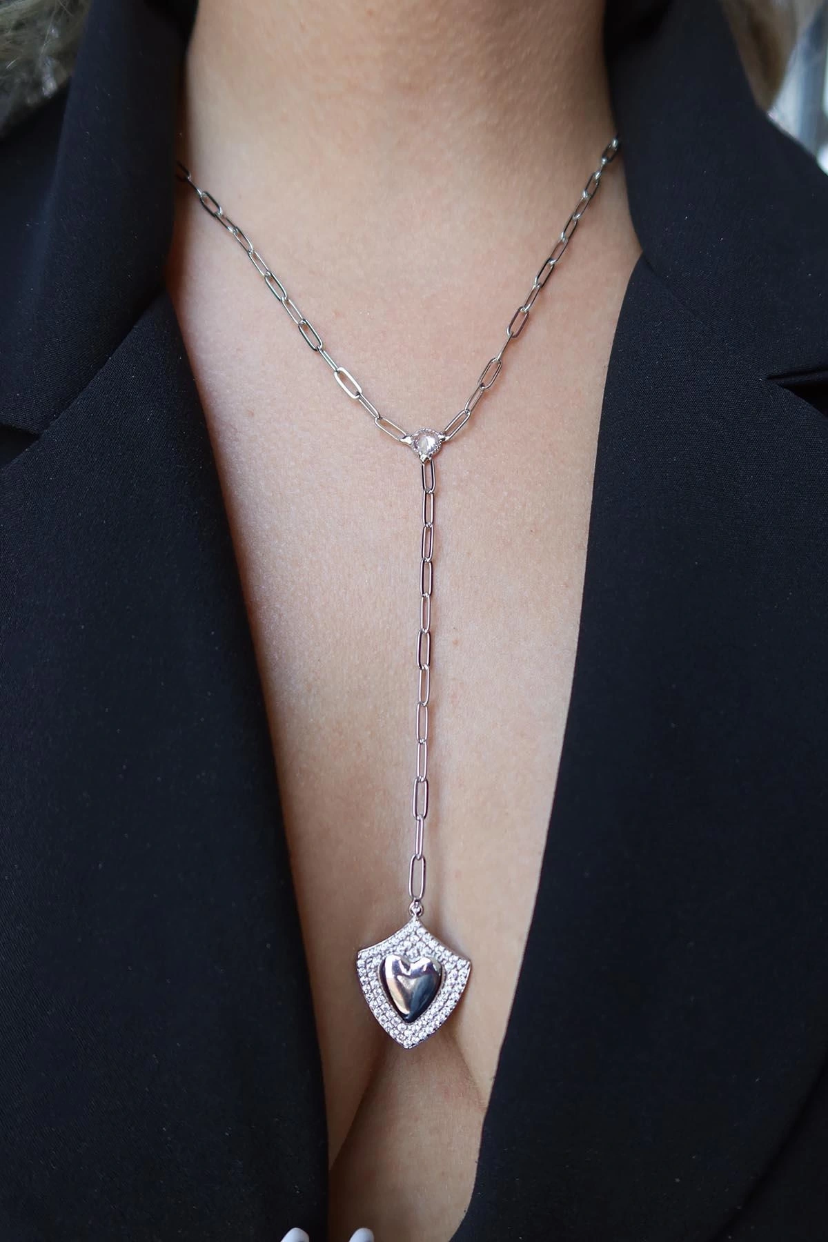 Gümüş Renk Kalp Figürlü Taş Detaylı Y Kolye