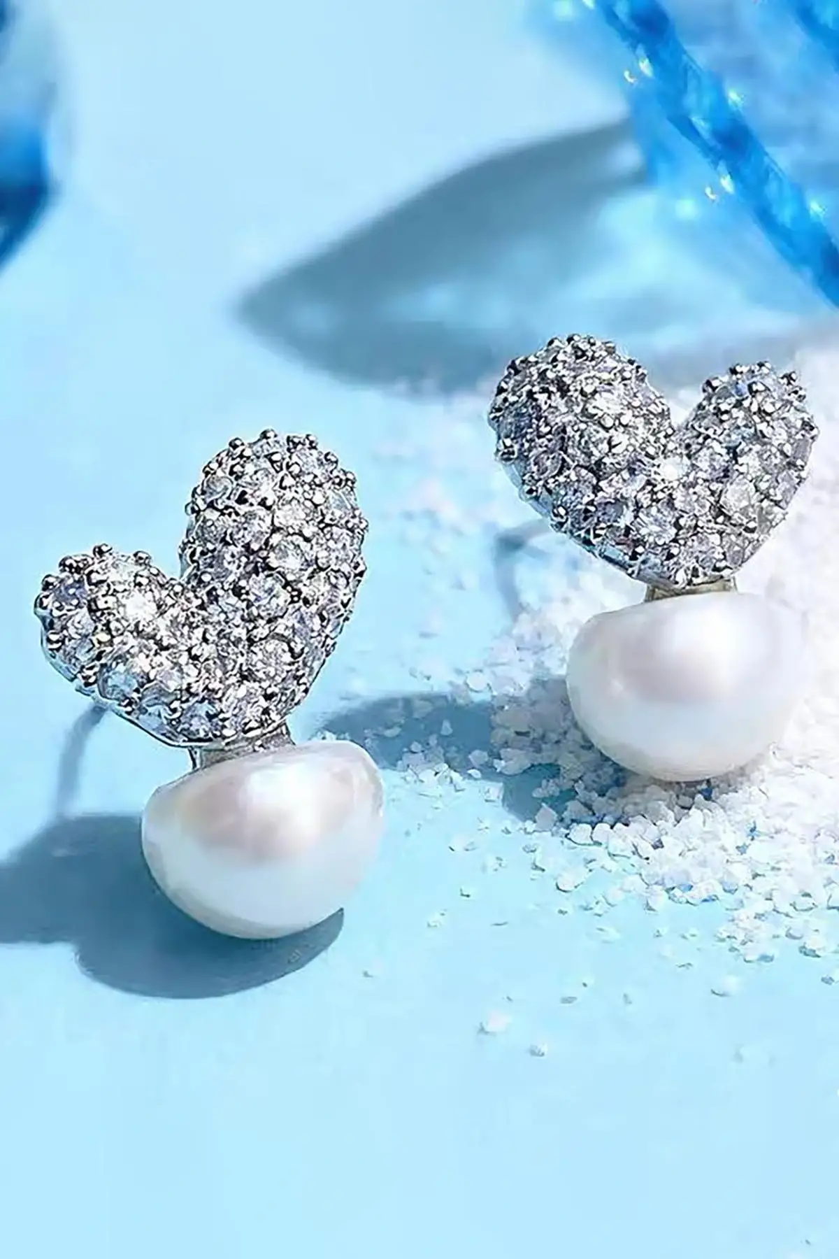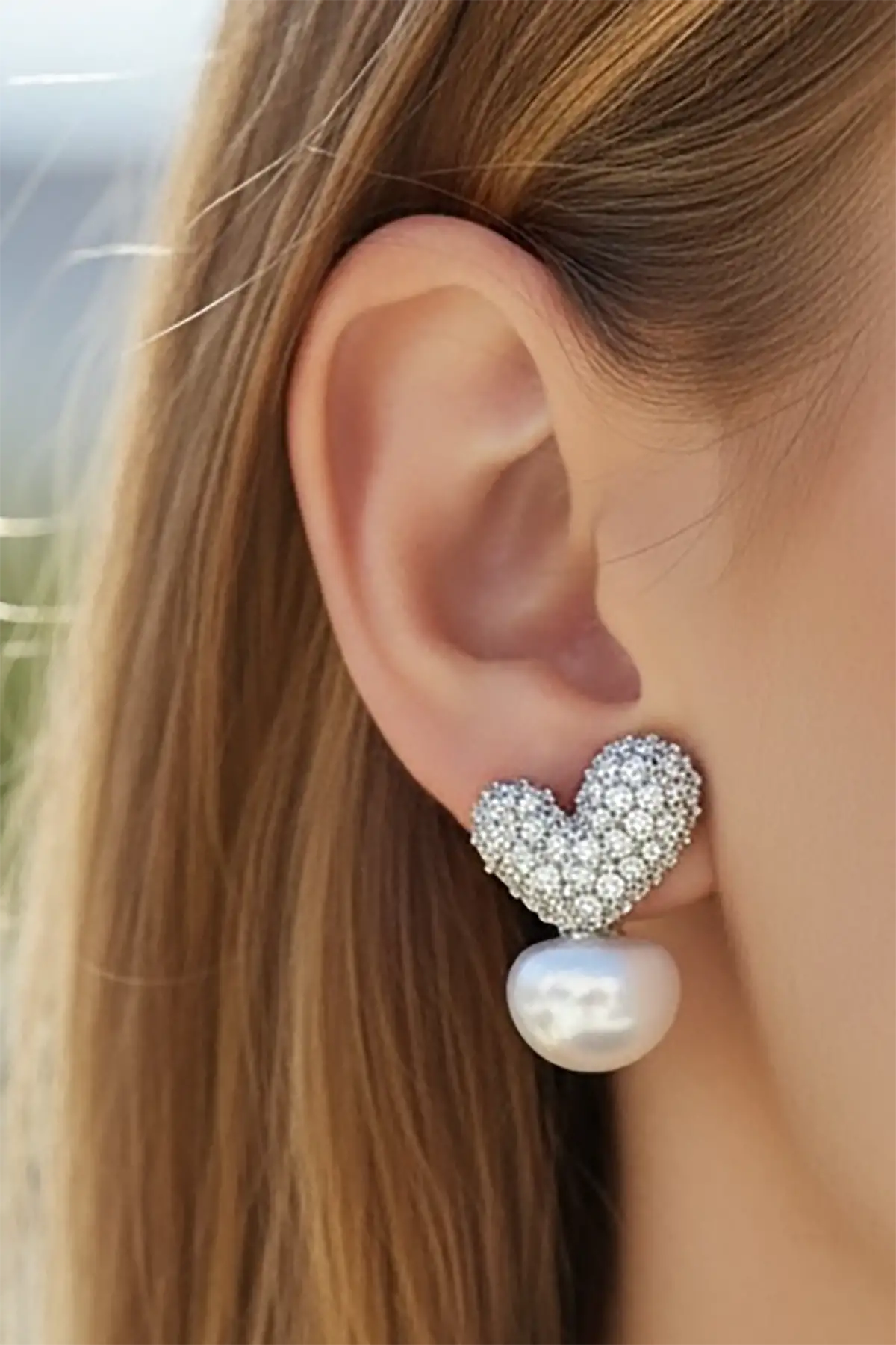 Gümüş Renk Kalp Figürlü Taş Ve İnci Detaylı 14K Altın Kaplama Küpe (Çift)