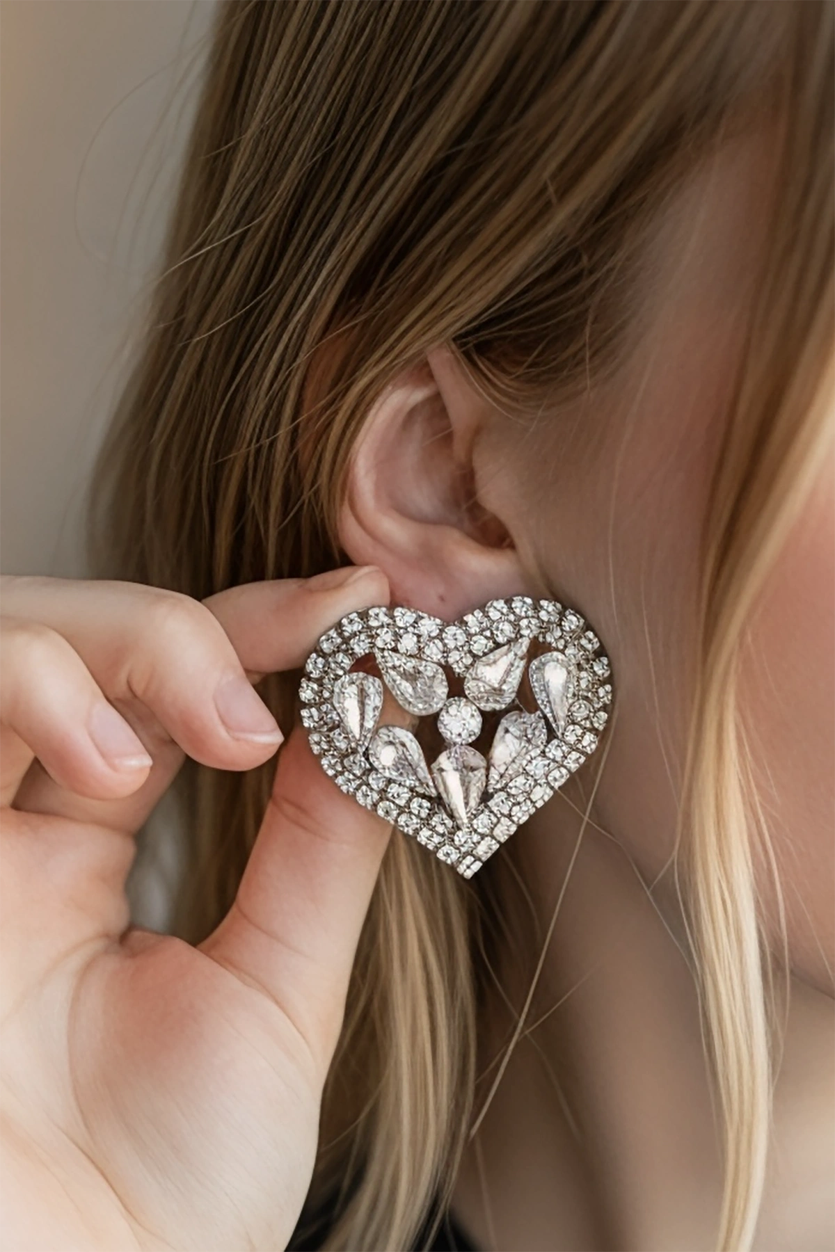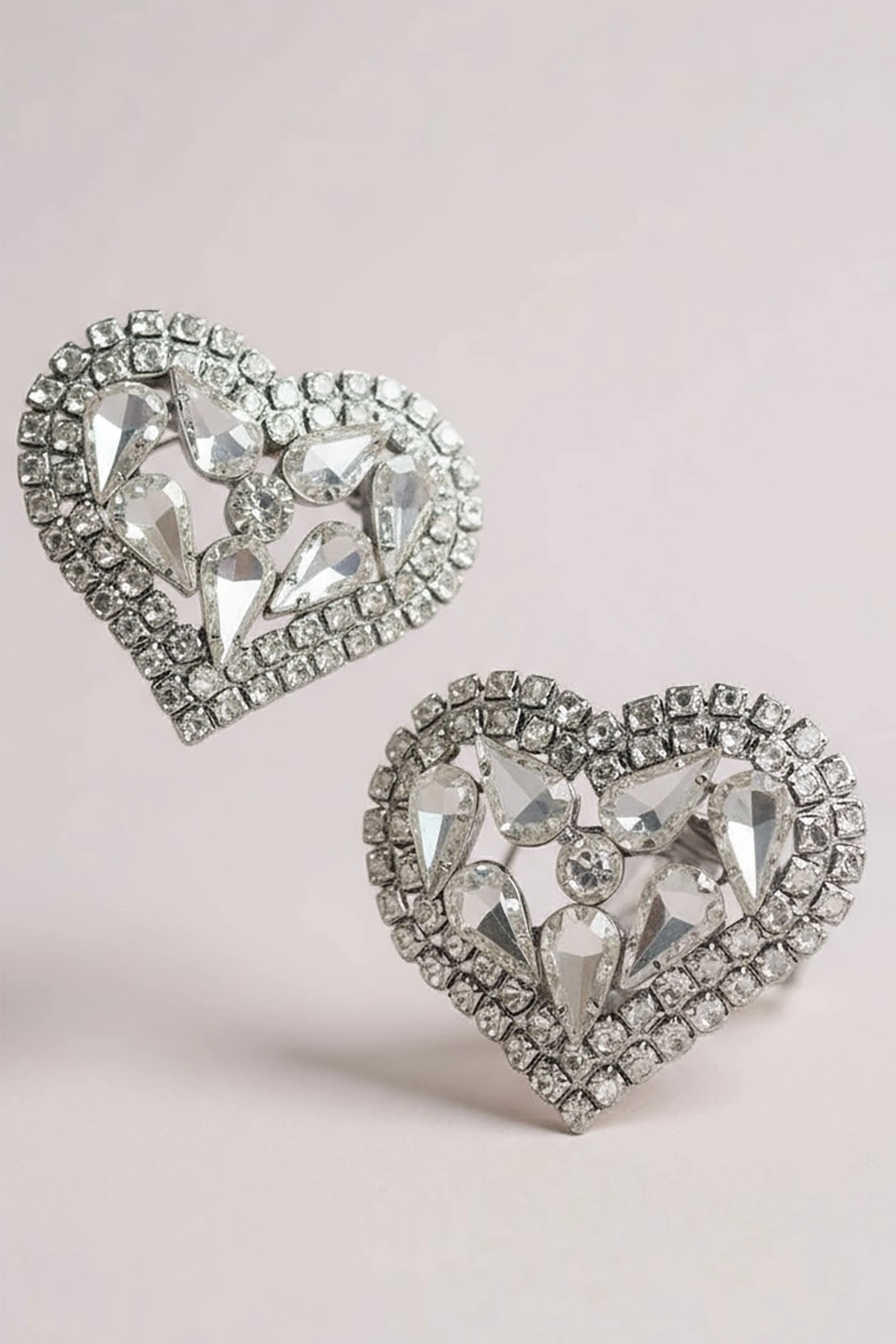 Gümüş Renk Kalp Figürlü Taşlı Abiye Küpe Kına/Gelin Küpe (Çift)