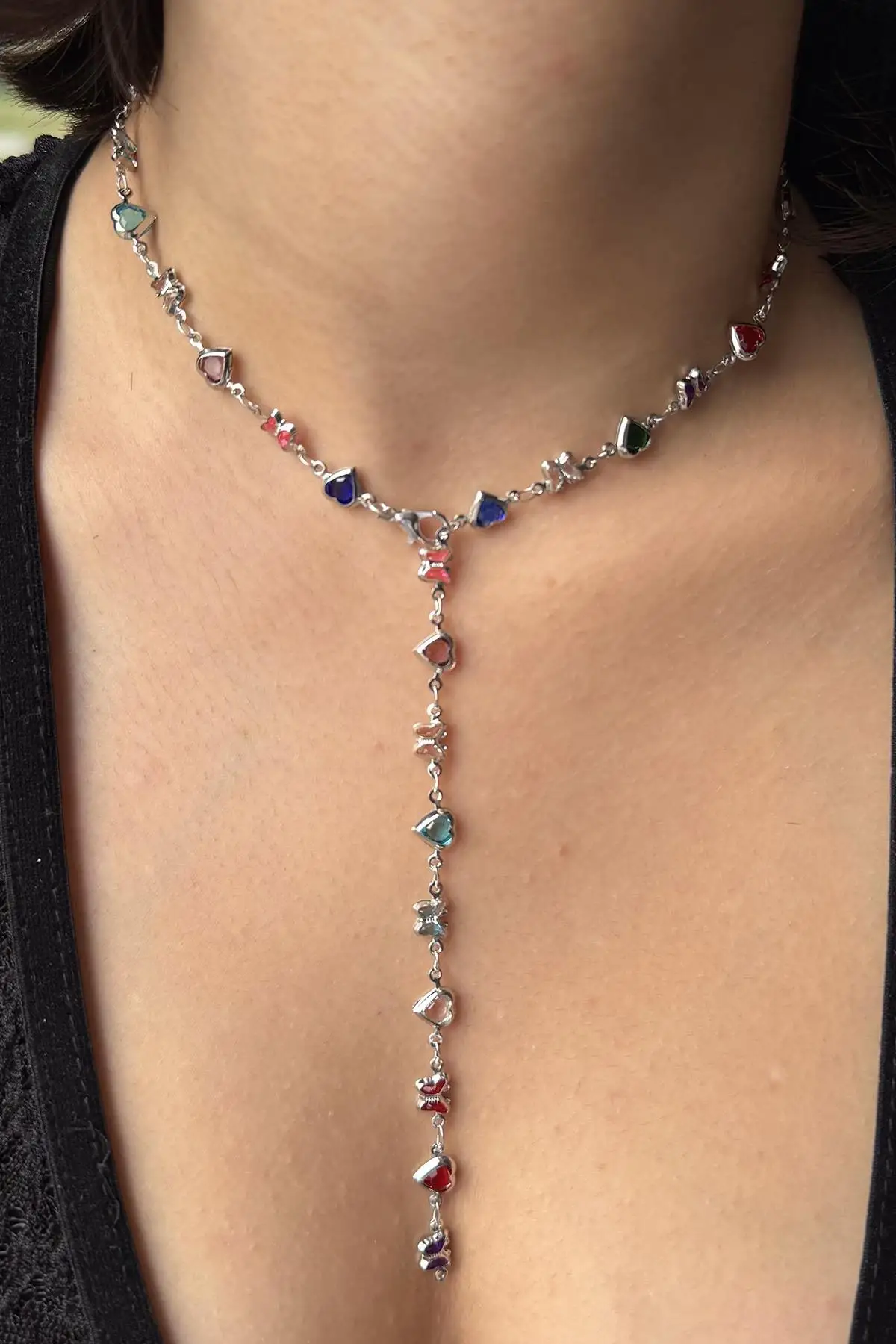 Gümüş Renk Kalp Ve Kelebek Figürlü Çelik Y Kolye