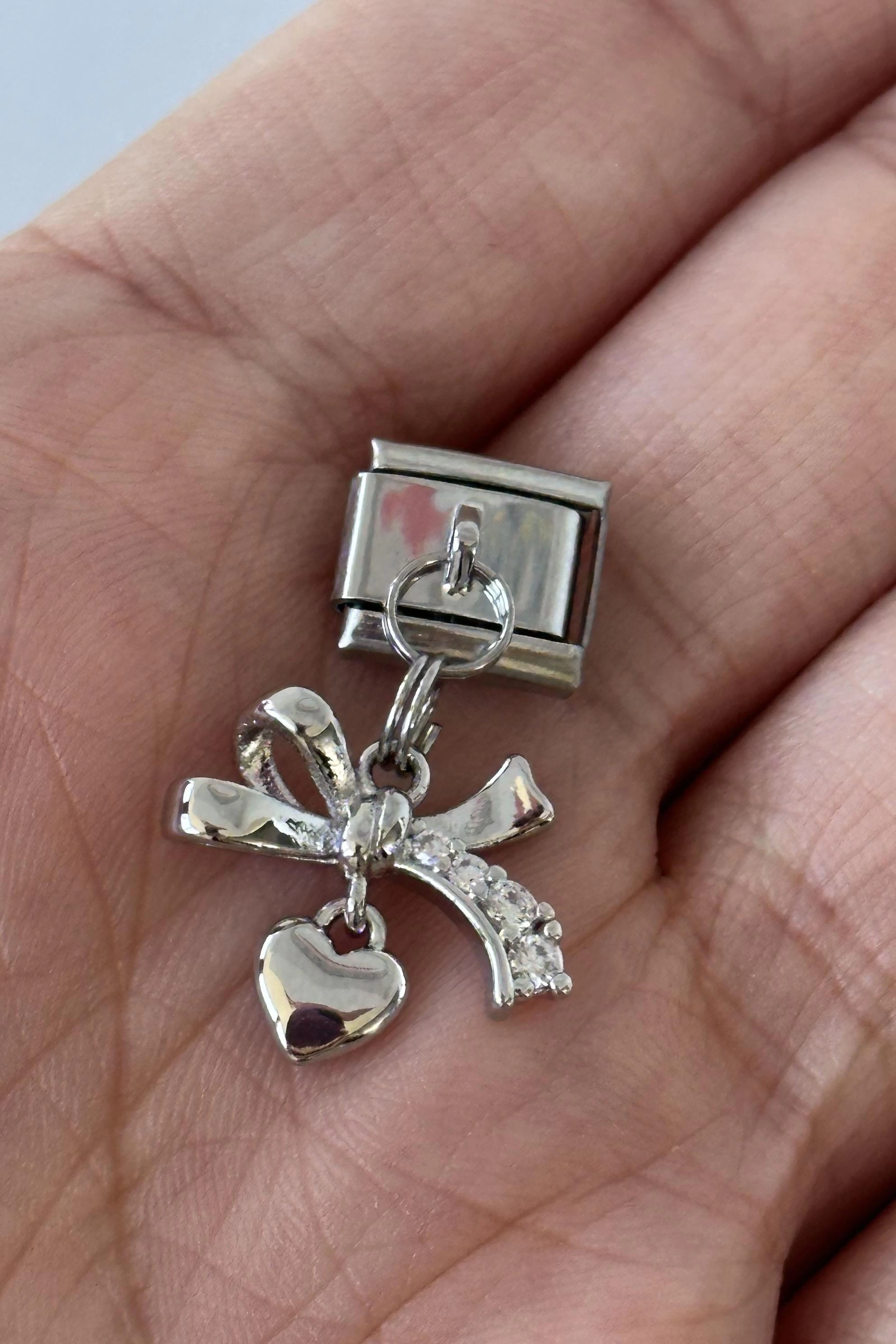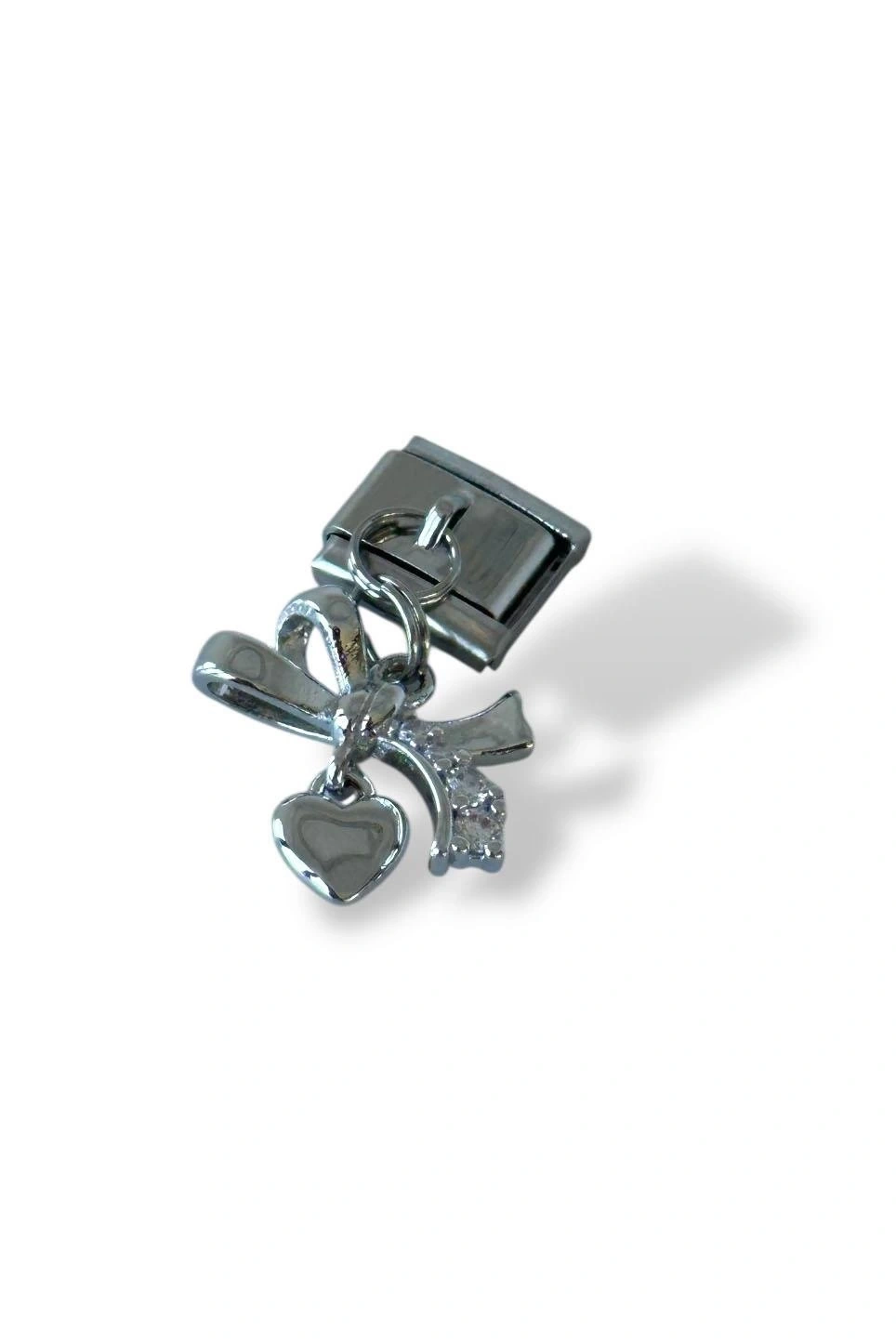 Gümüş Renk Kalp Ve Kurdele Figürlü Taş Detaylı Çelik Nomination Charm (Tek)