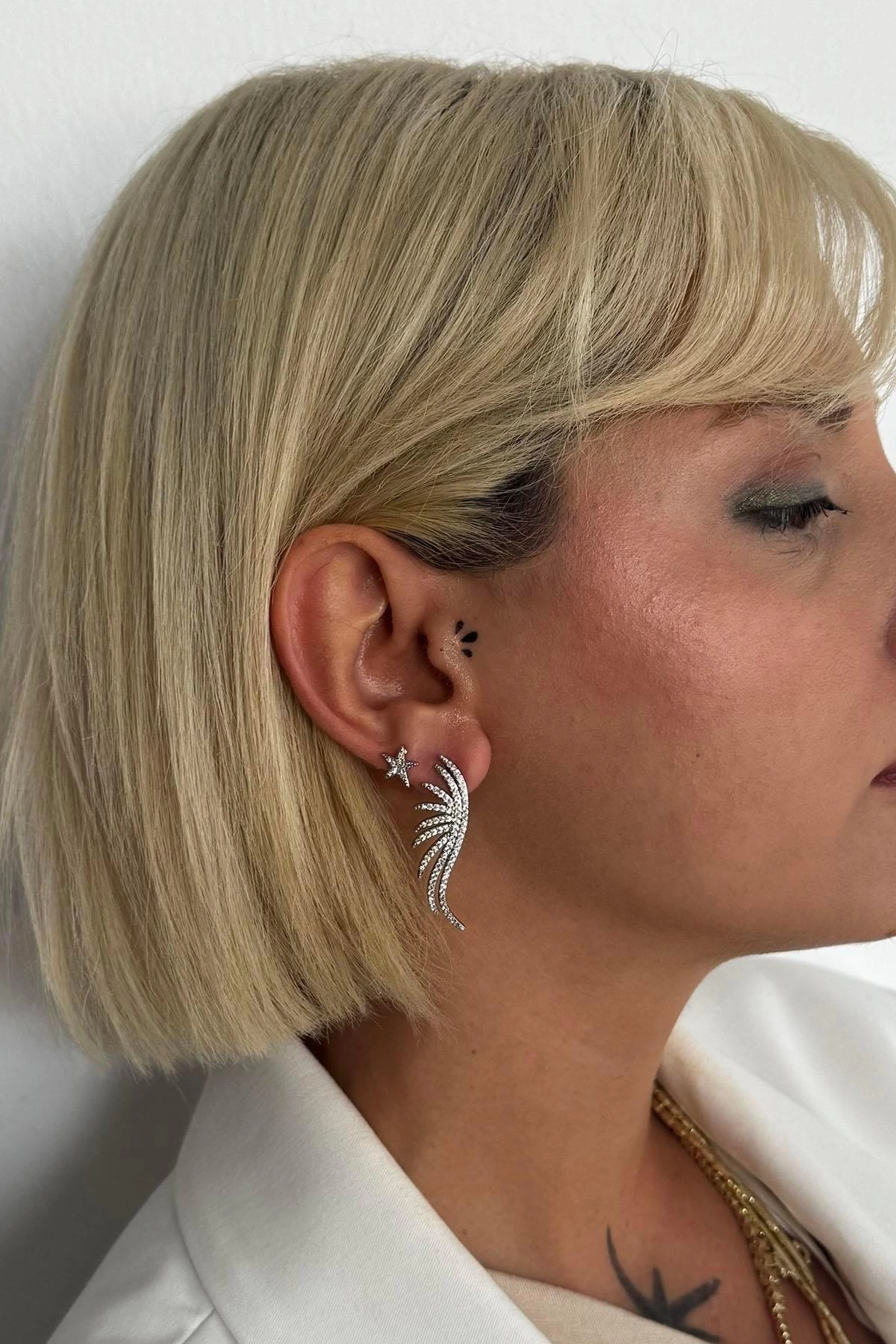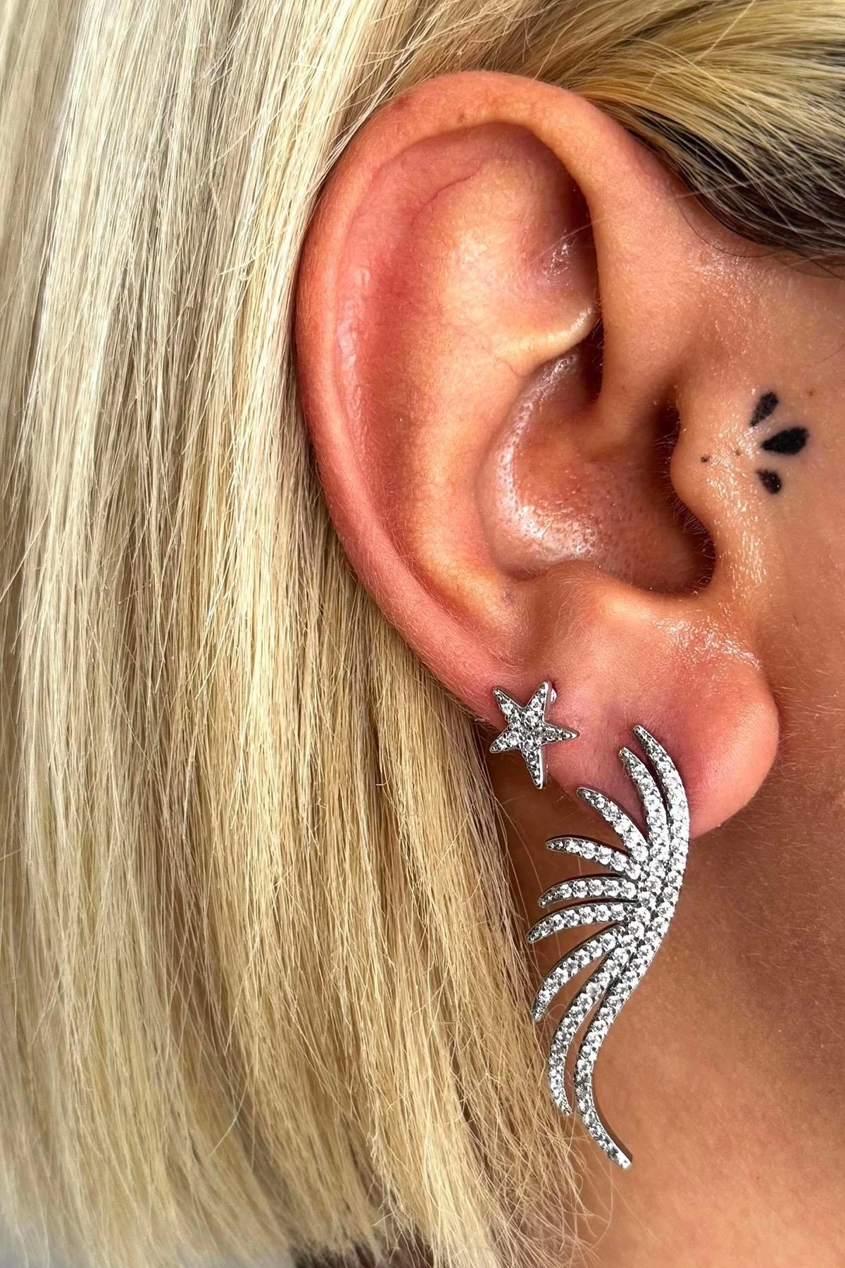 Gümüş Renk Kanat Ve Yıldız Figürlü Taş Detaylı Küpe (Çift)