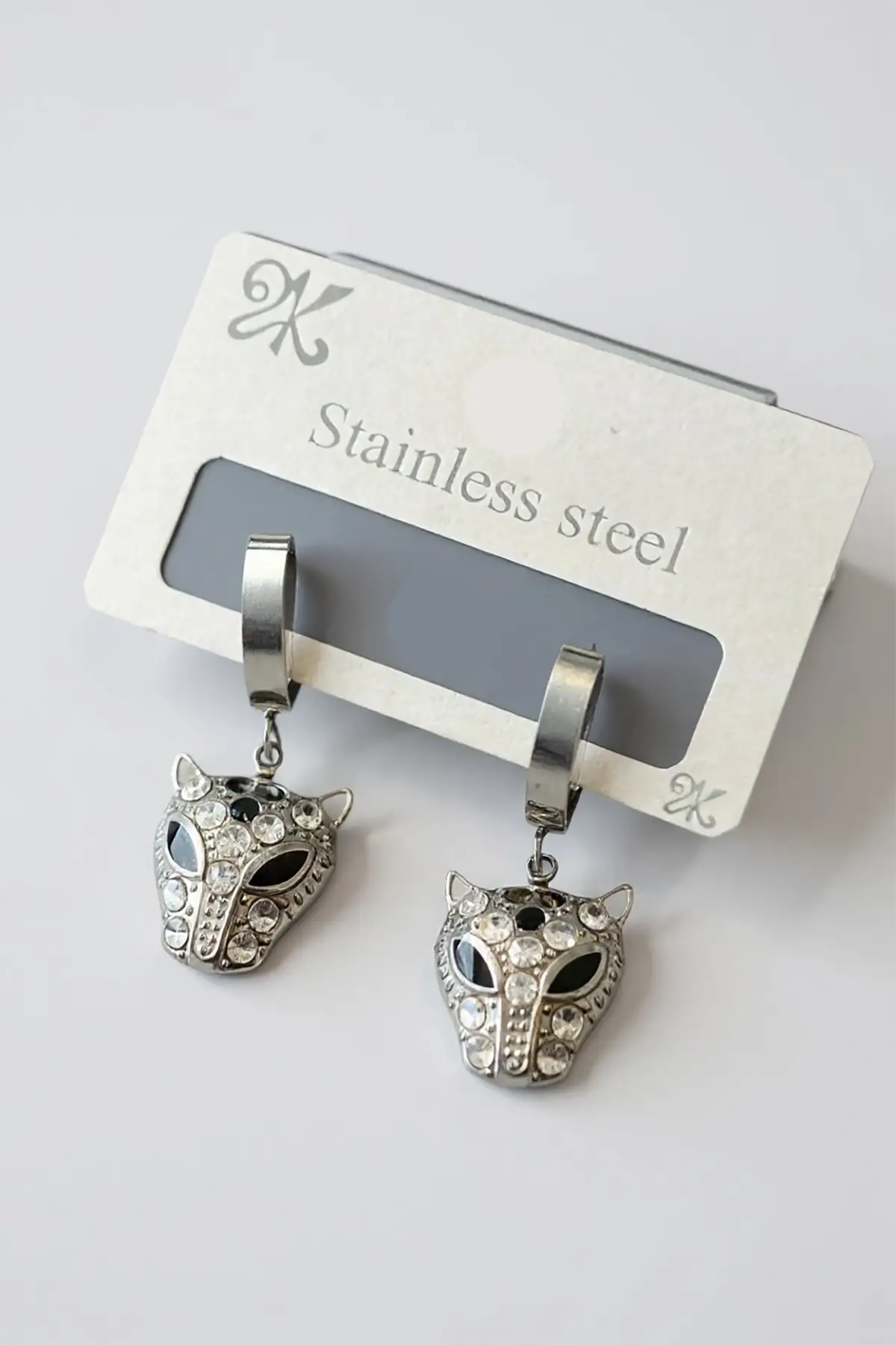 Gümüş Renk Kaplan Figürlü Taş Detaylı Çelik Küpe (Çift)
