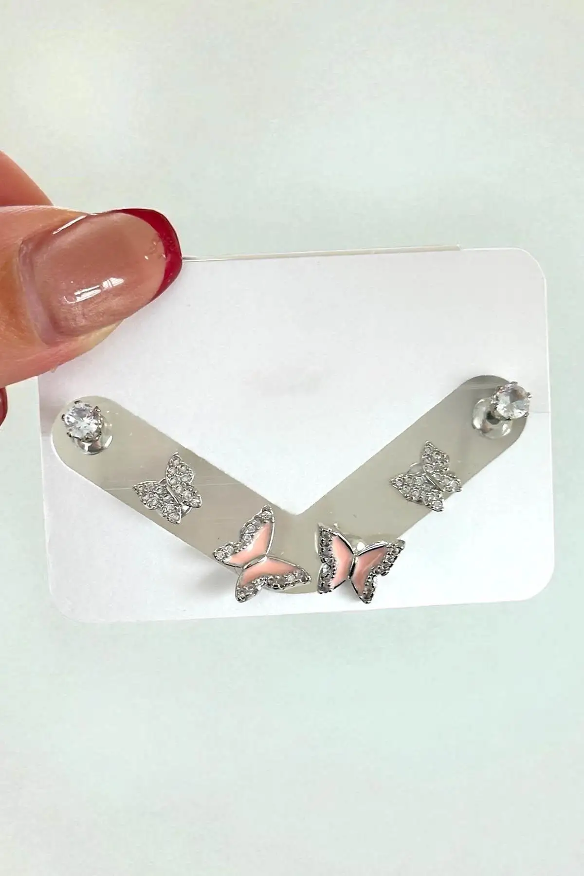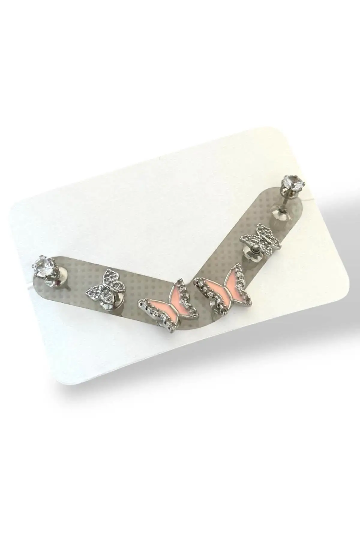Gümüş Renk Kelebek Figürlü Taş Detaylı 6'lı Küpe Set