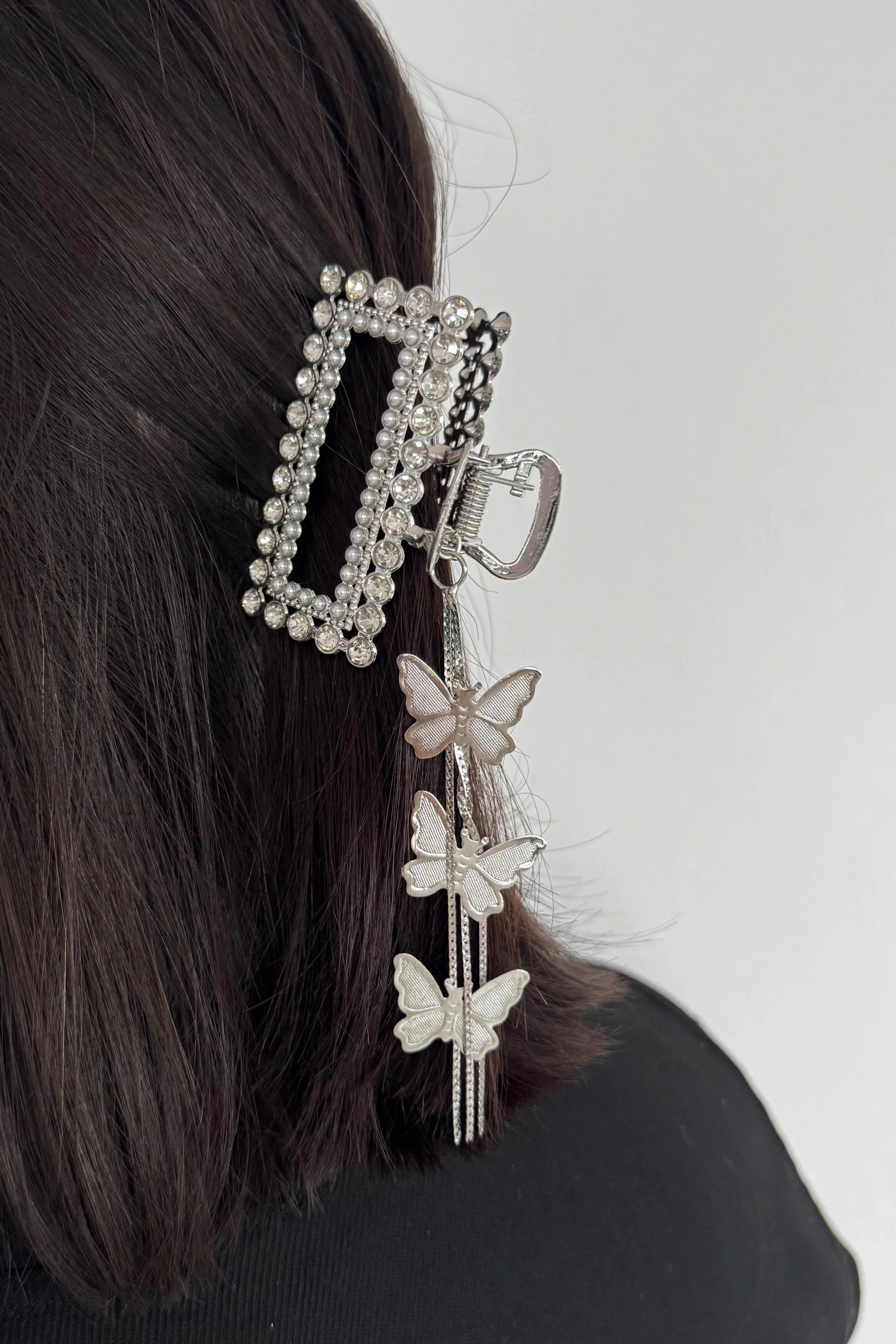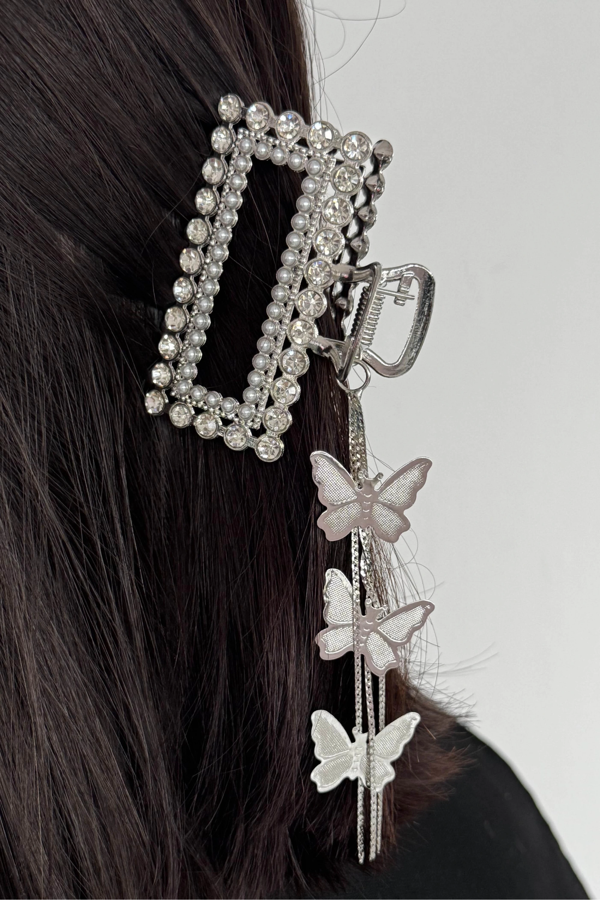 Gümüş Renk Kelebek Figürlü Taş Detaylı Sallantılı Mandal Toka