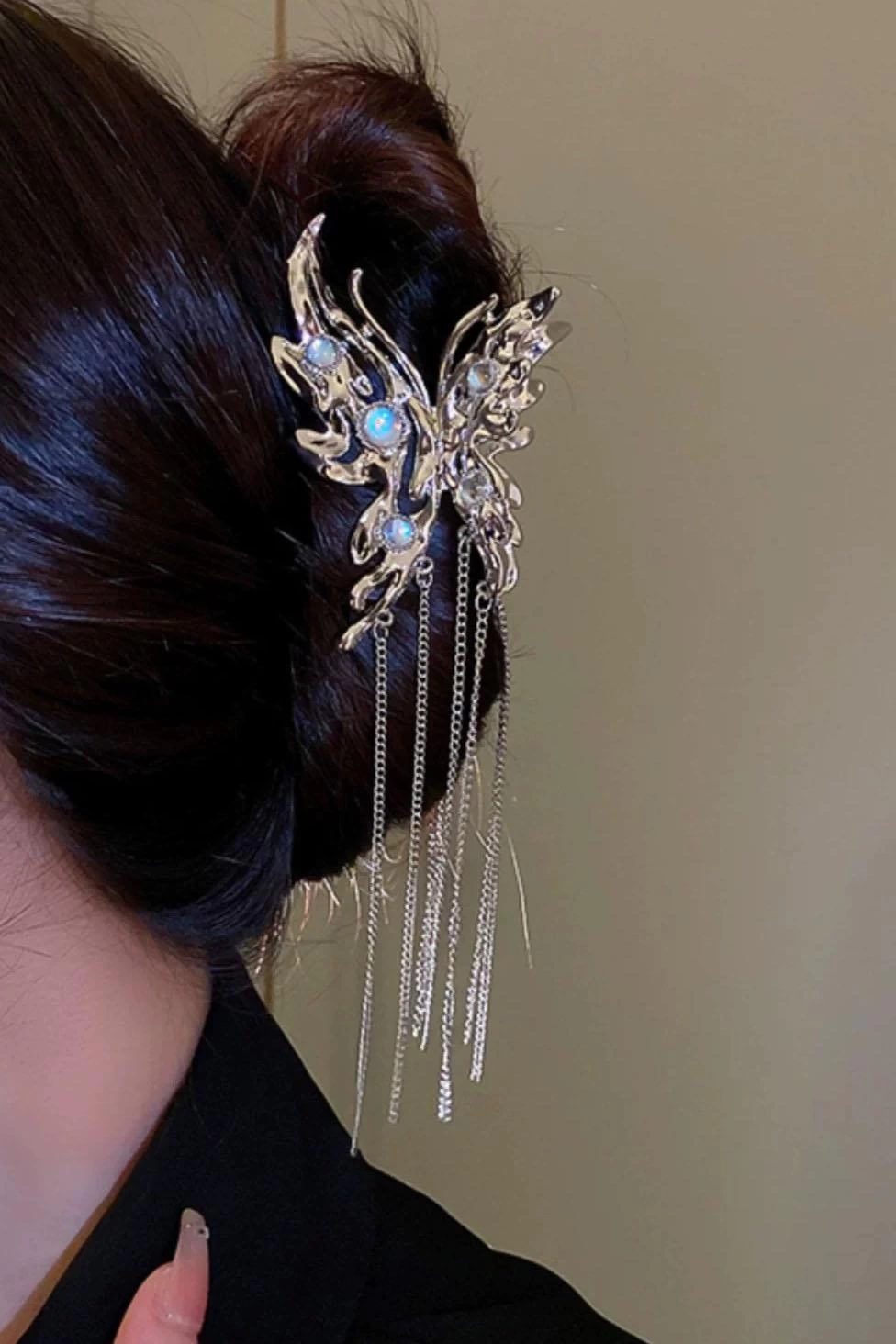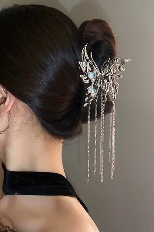 Gümüş Renk Kelebek Figürlü Taş Detaylı Sallantılı Metal Mandal Toka