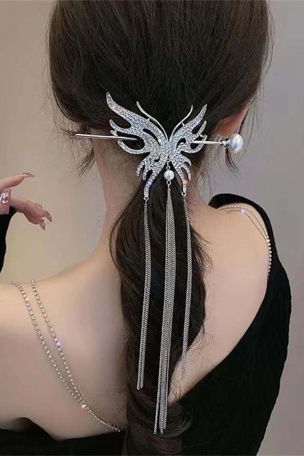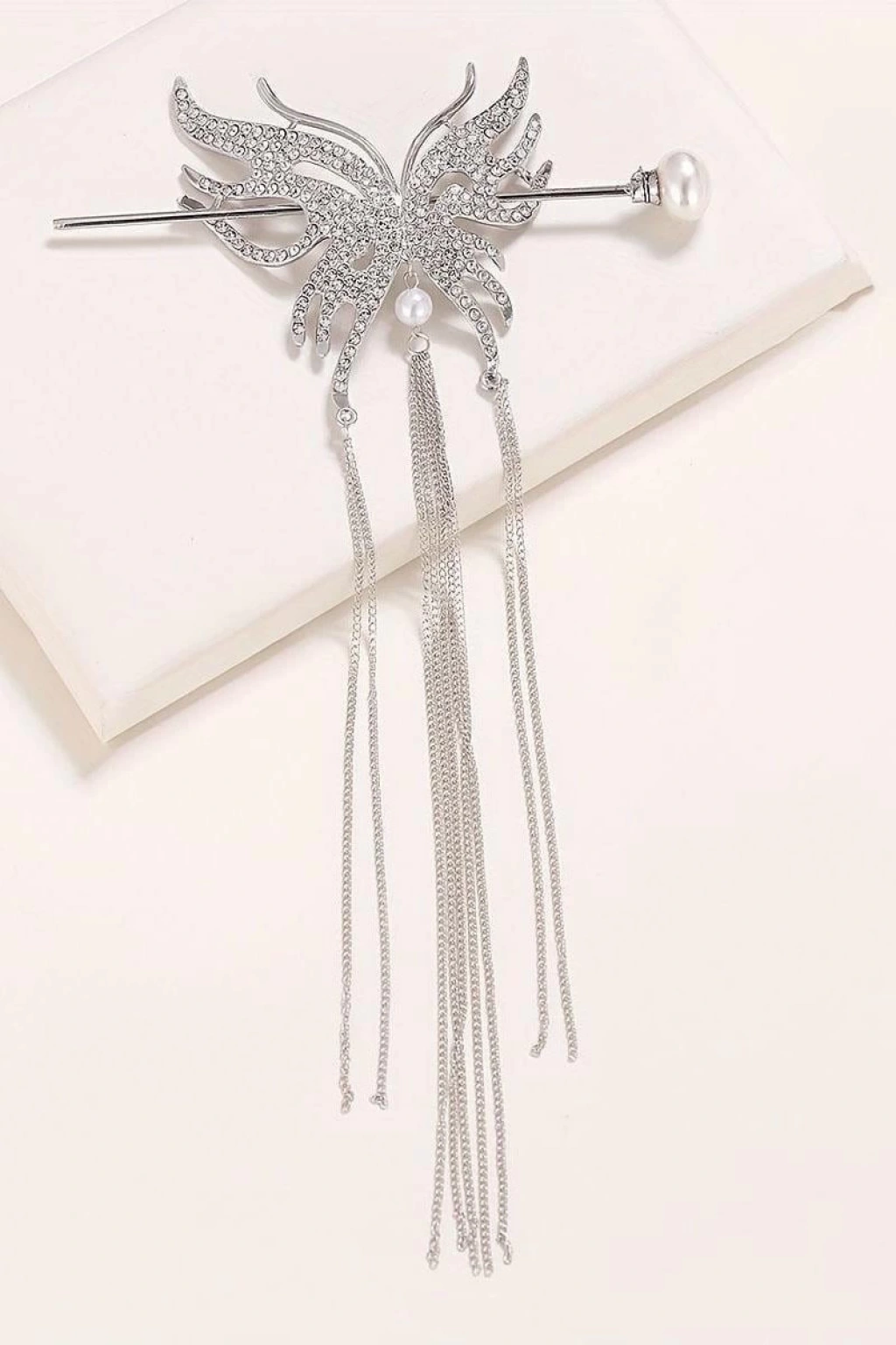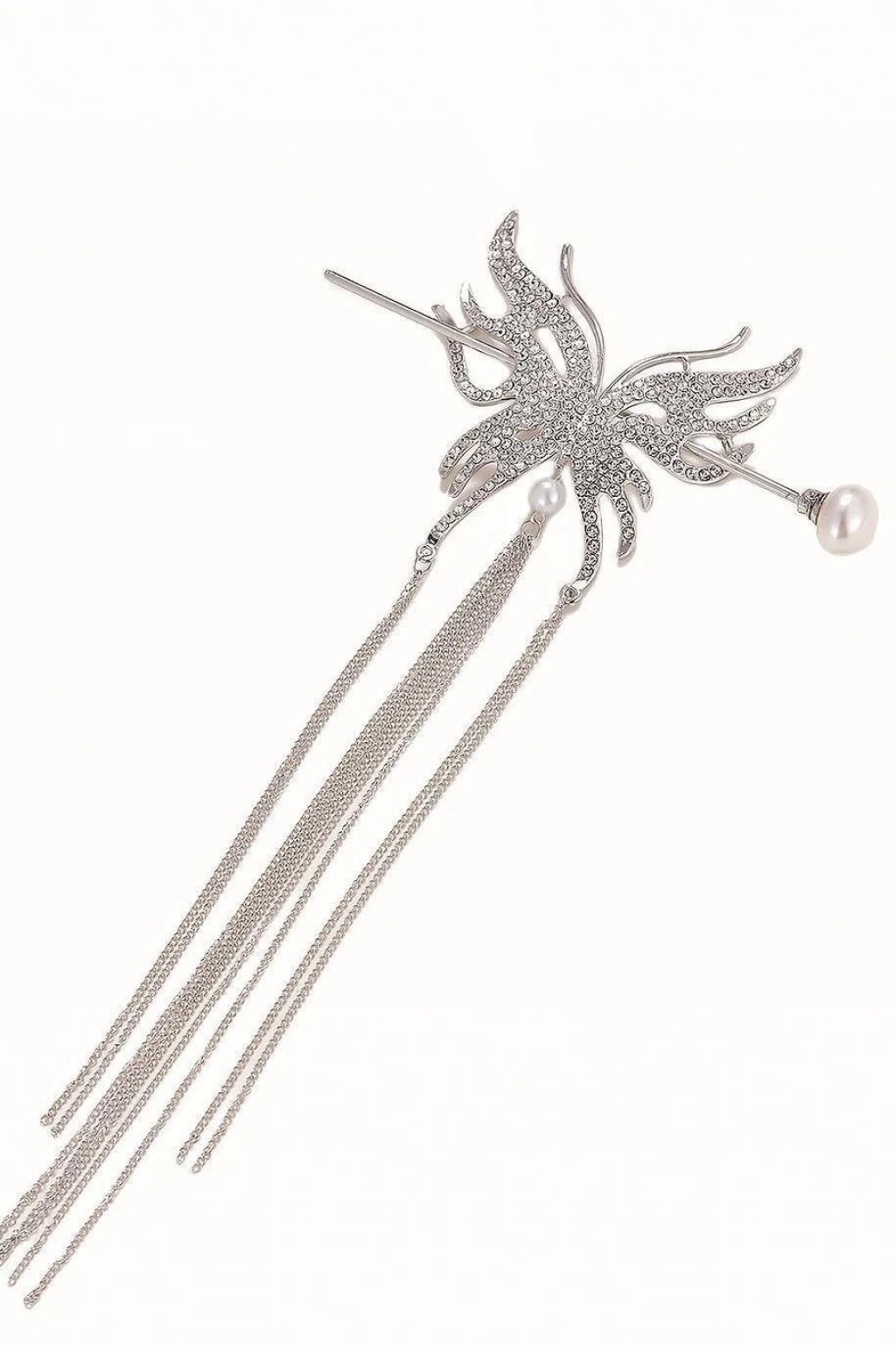 Gümüş Renk Kelebek Figürlü Taşlı Sallantılı Topuz Toka