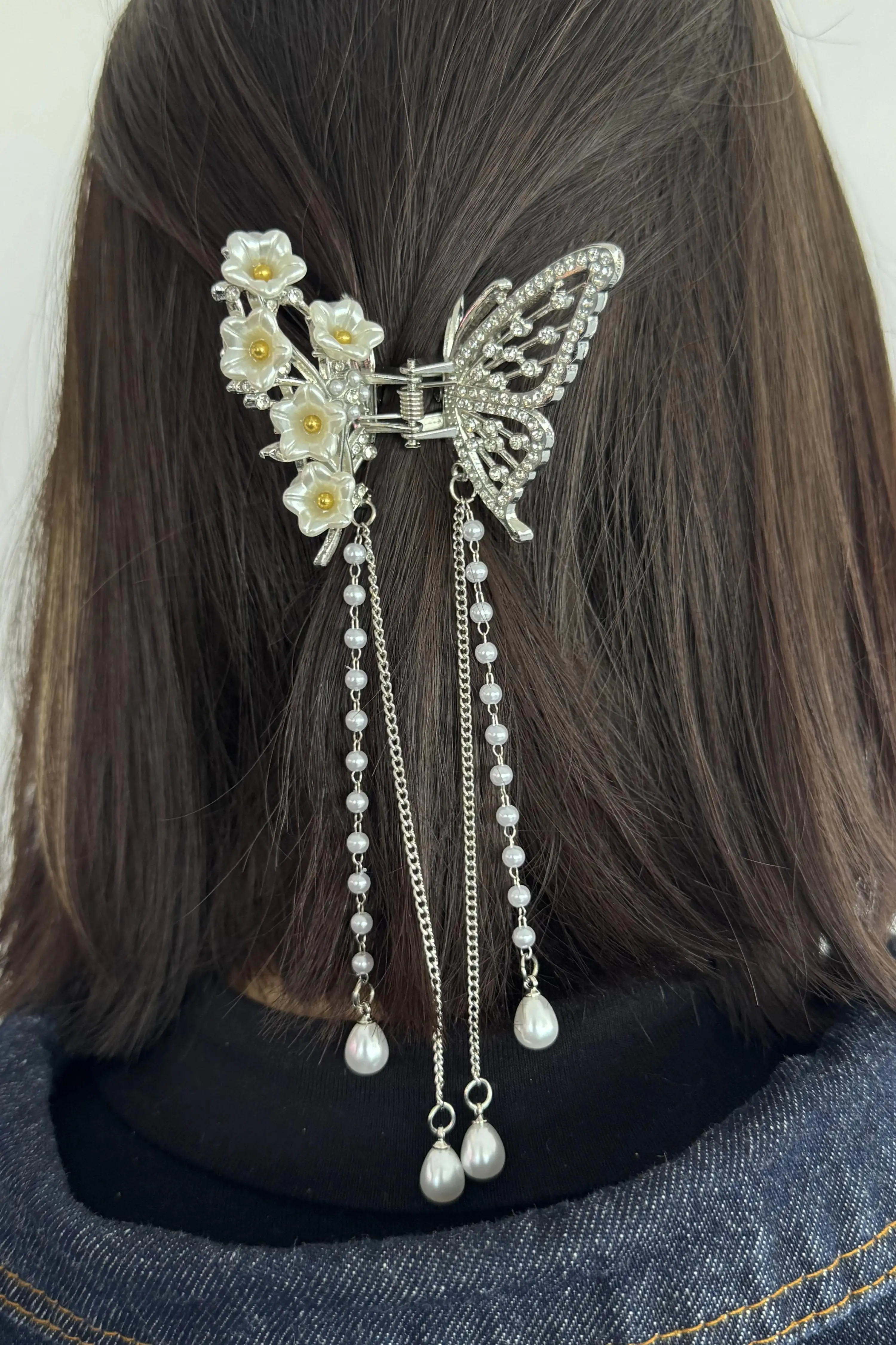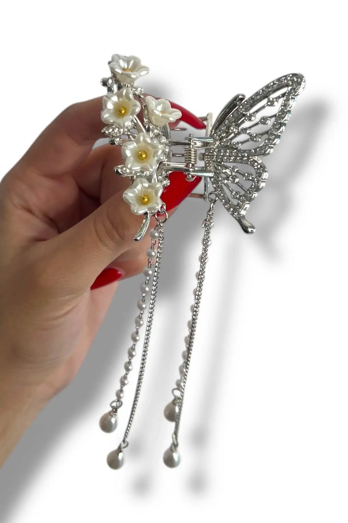 Gümüş Renk Kelebek Ve Papatya Figürlü İnci Detaylı Metal Mandal Toka