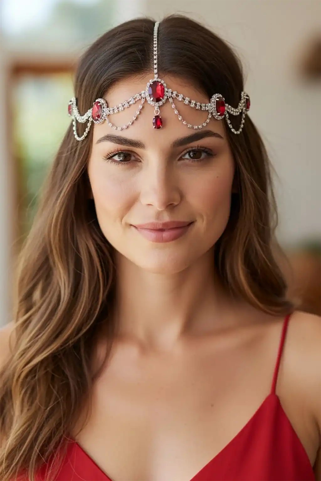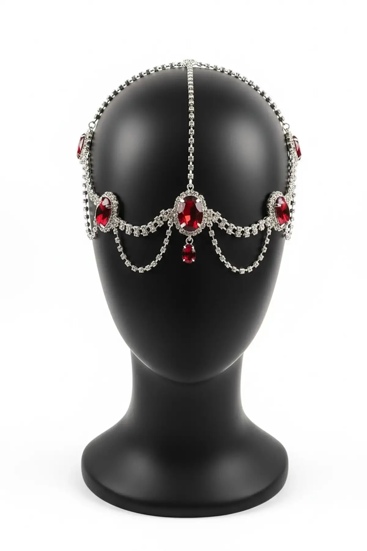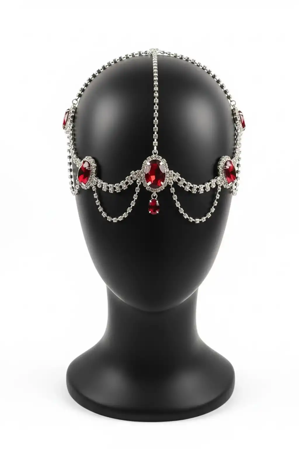 Gümüş Renk Kırmızı Taş Detaylı Alınlık/Kına Aksesuarı