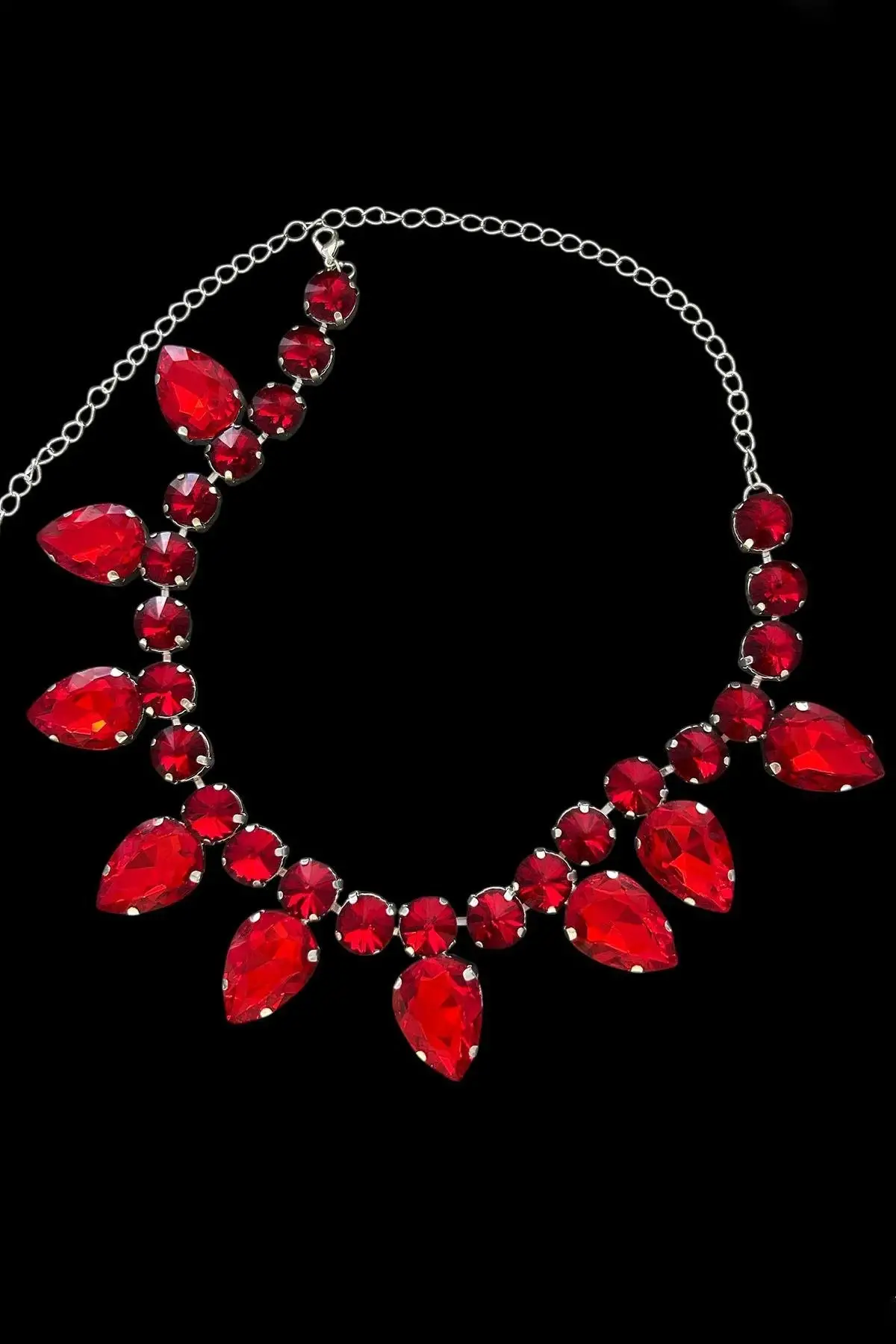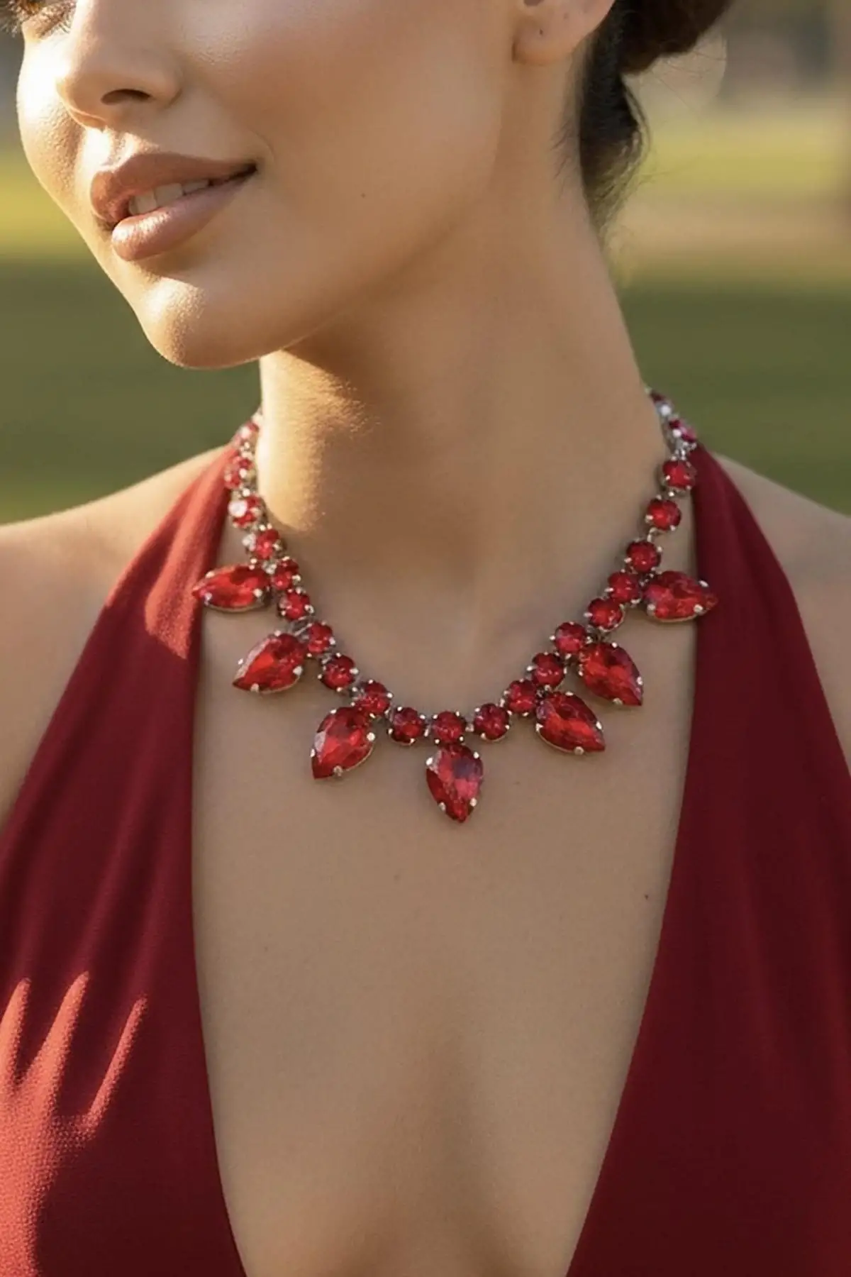 Gümüş Renk Kırmızı Taş Detaylı Tasarım Abiye Kolye