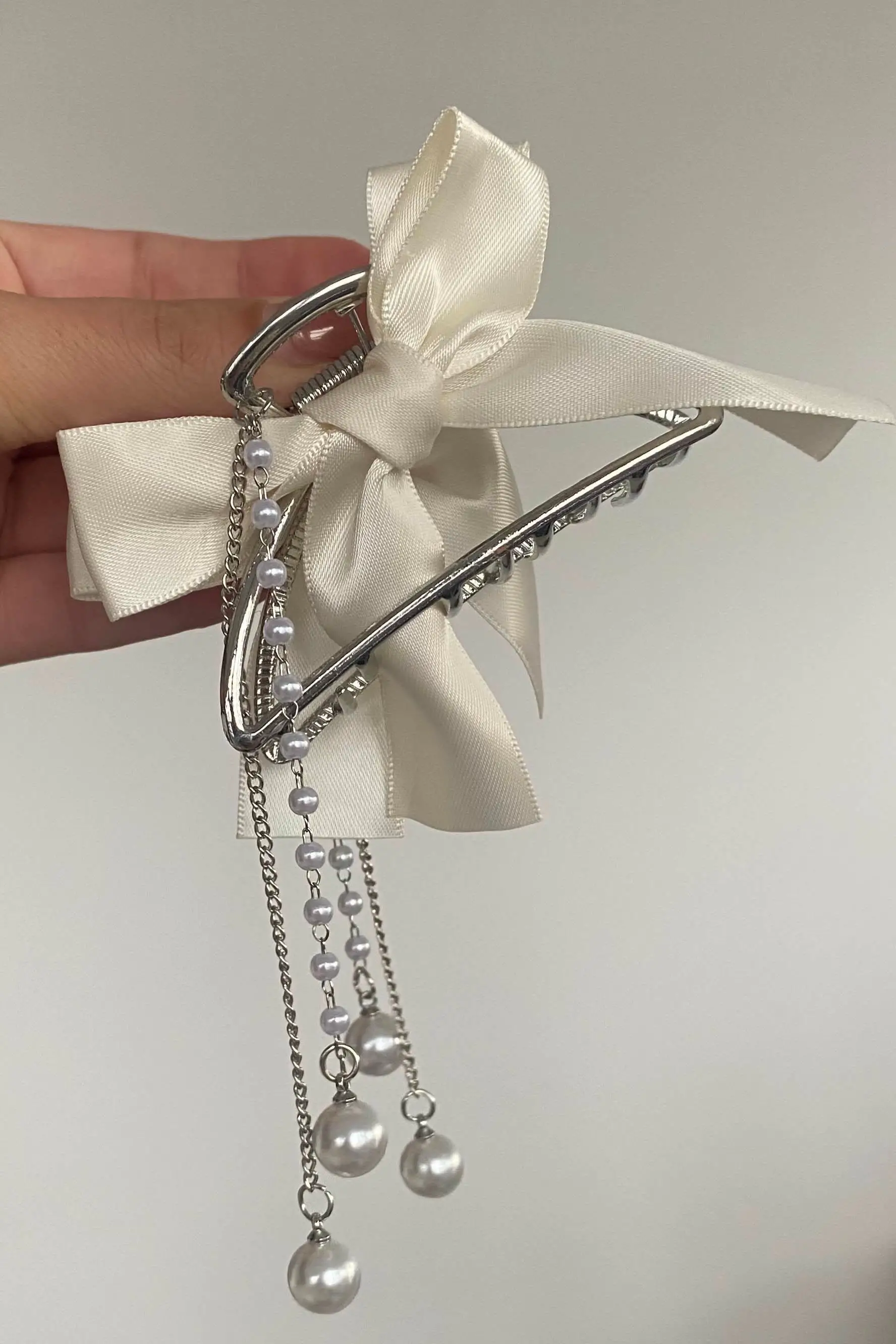 Gümüş Renk Kurdele Figürlü İnci Detaylı Metal Mandal Toka
