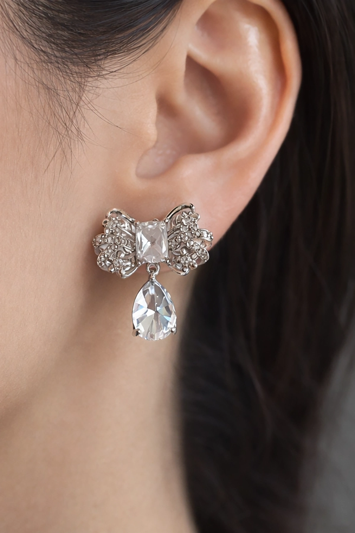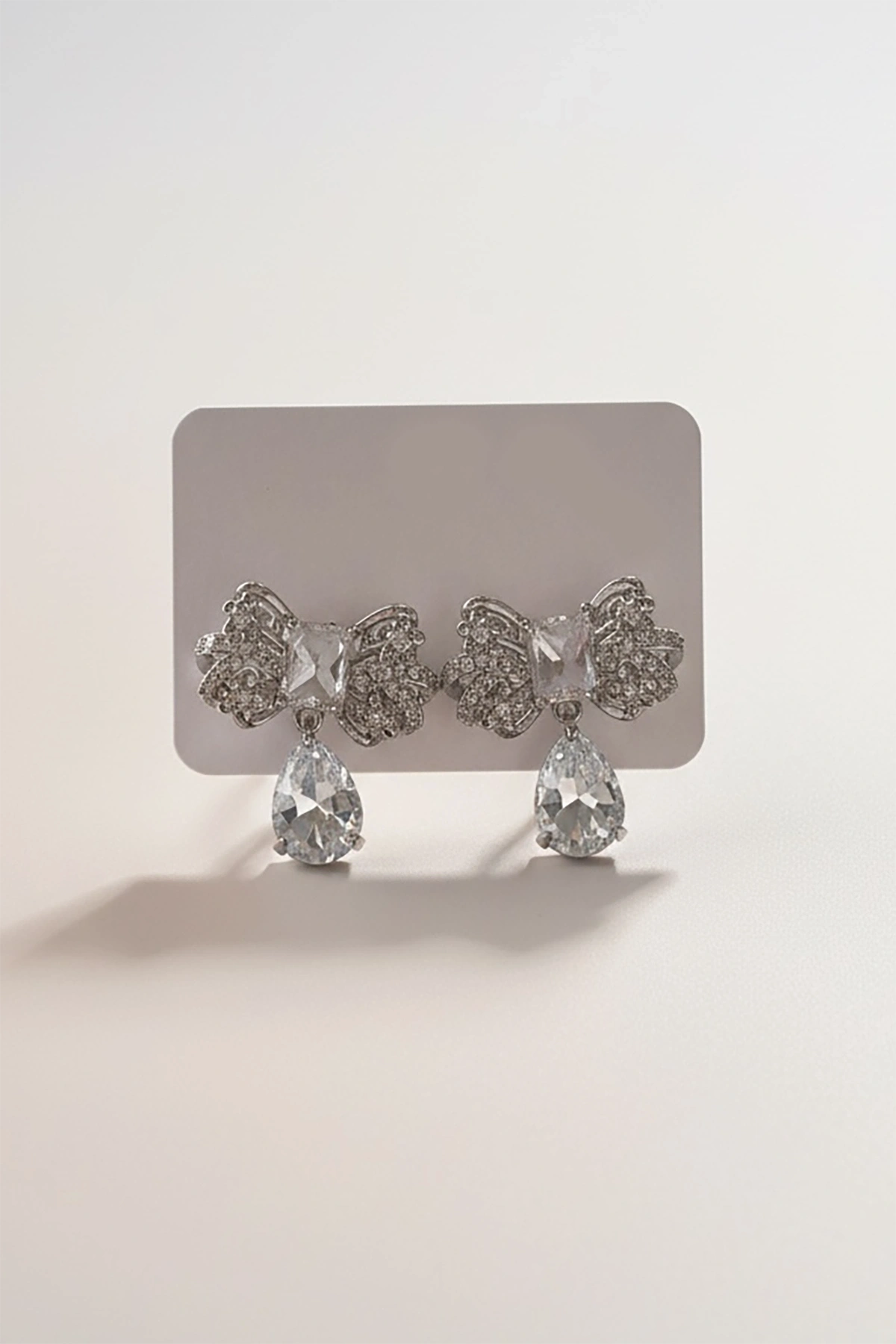Gümüş Renk Kurdele Figürlü Taş Detaylı 14K Altın Kaplama Küpe (Çift)