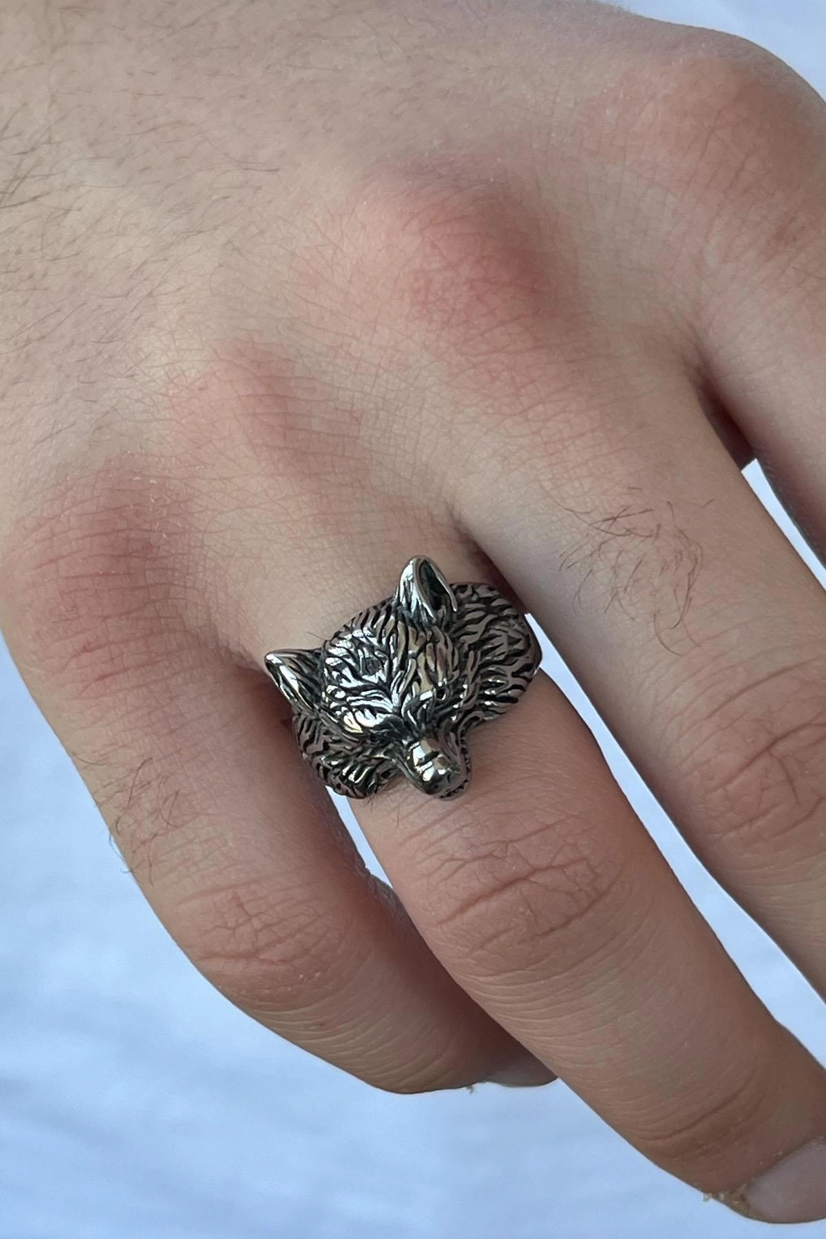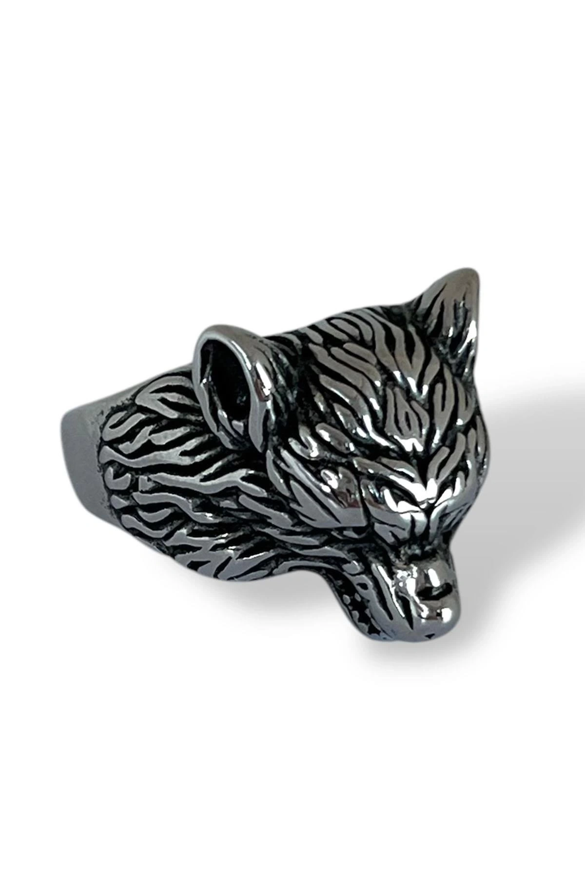 Gümüş Renk Kurt Figürlü Ayarlanabilir Çelik Erkek Yüzük