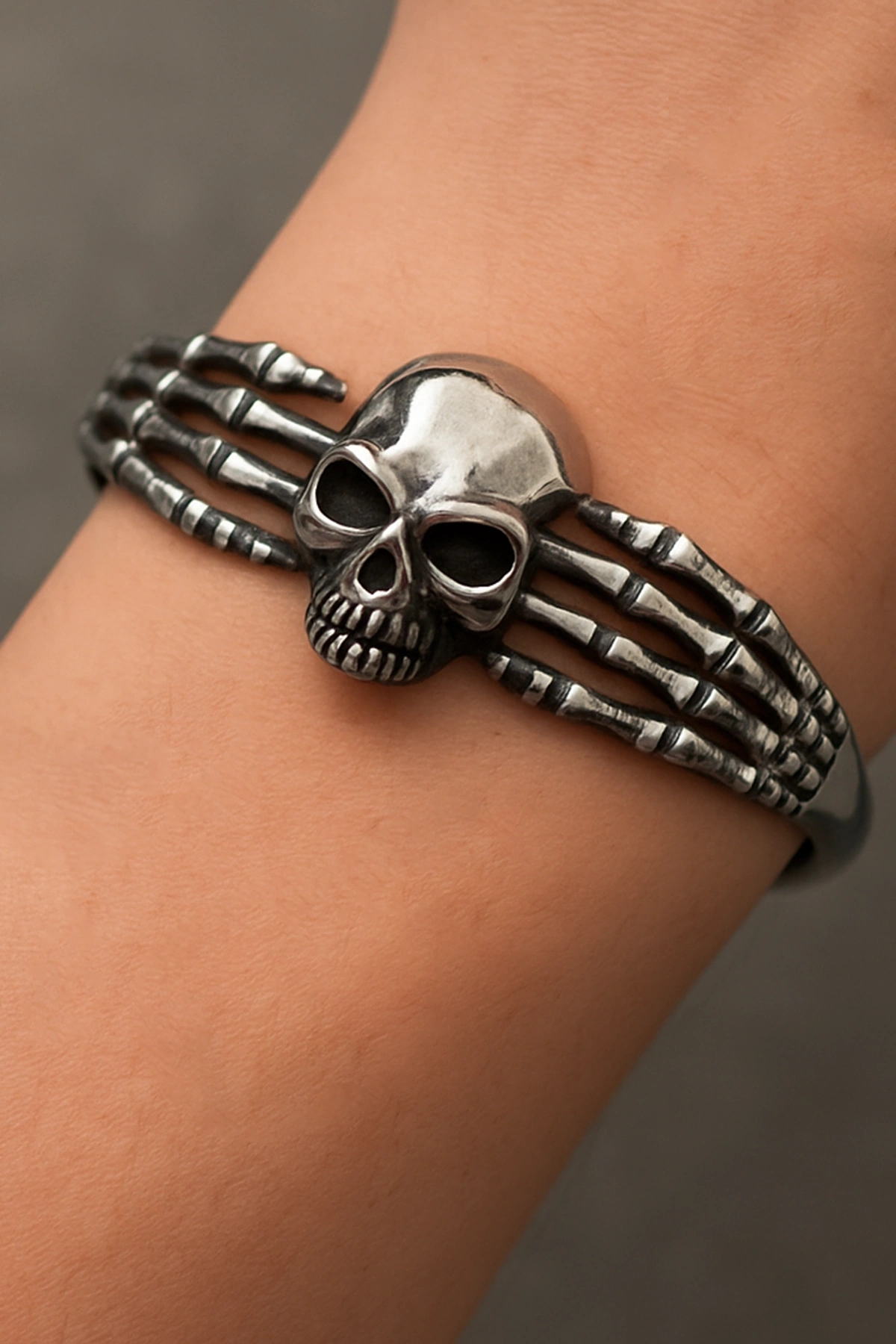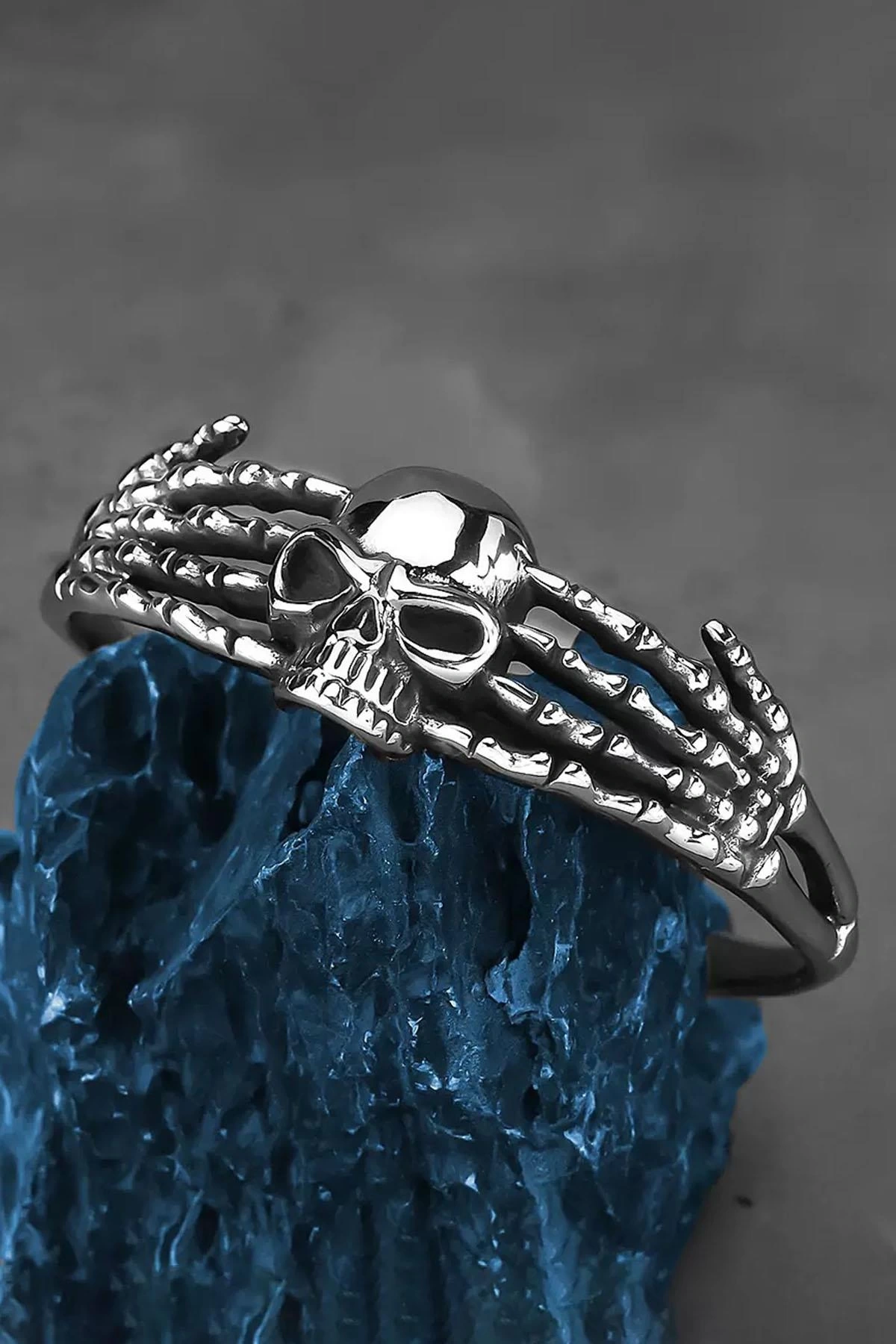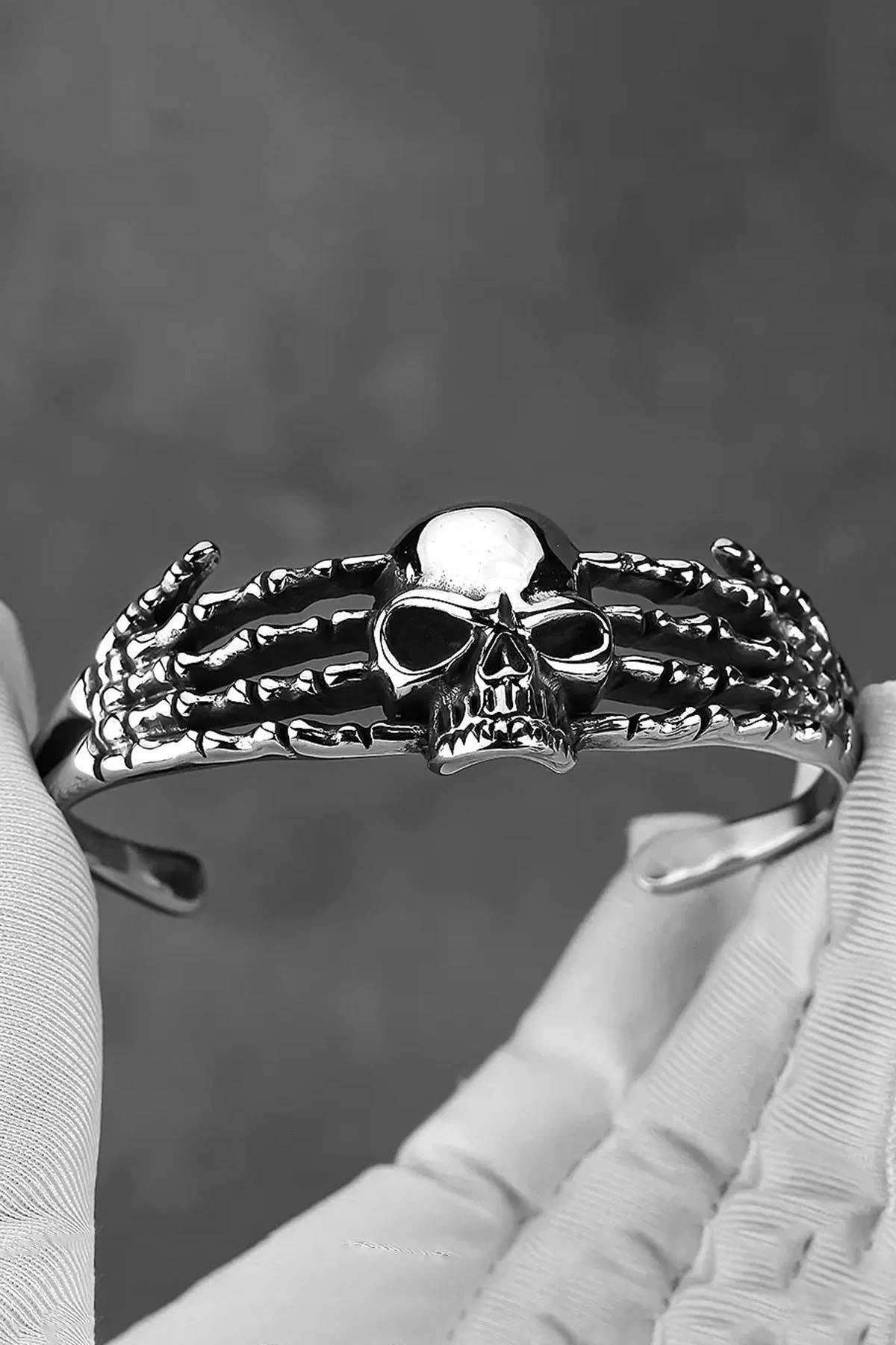 Gümüş Renk Kurukafa Figürlü Erkek Çelik Kelepçe Bileklik