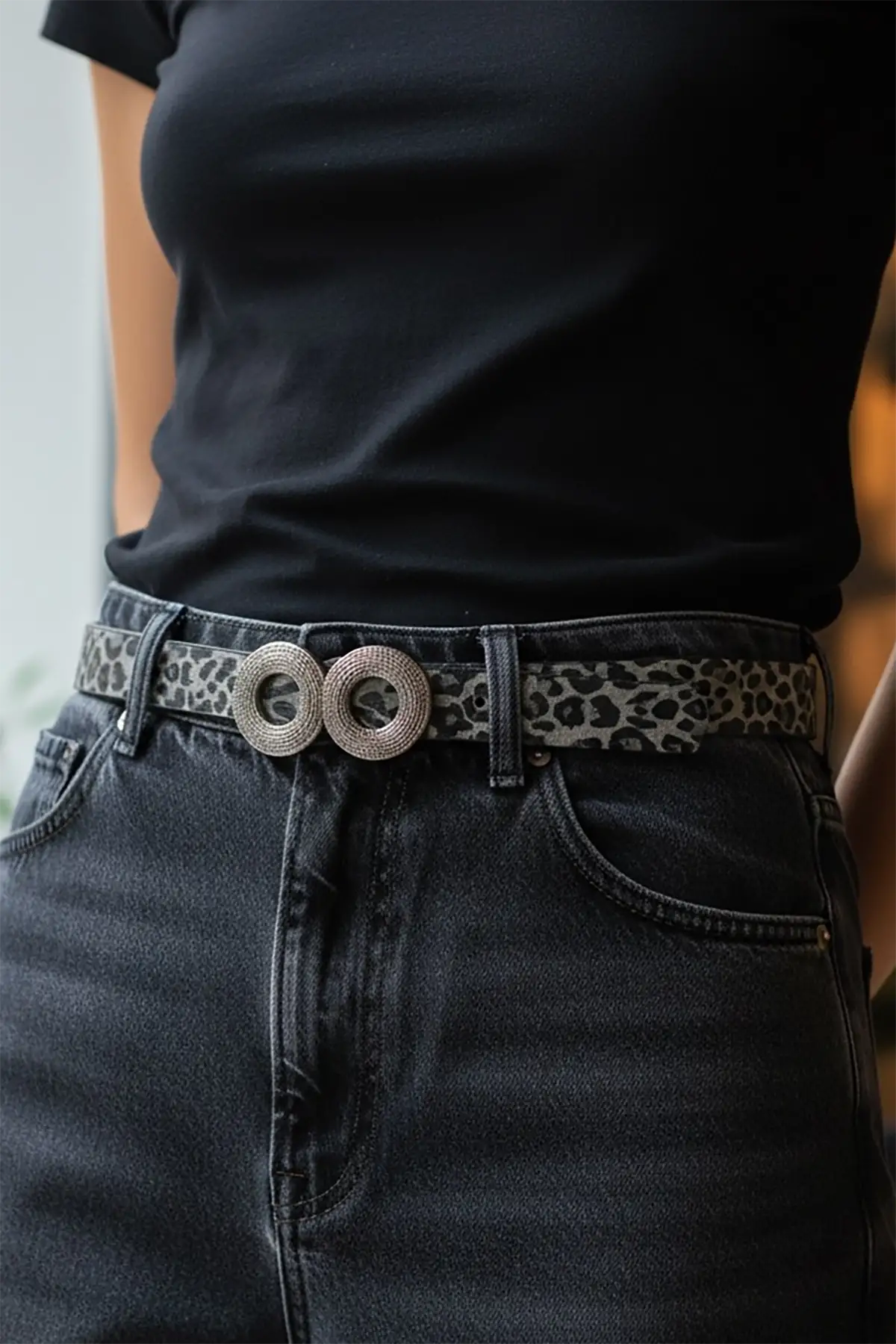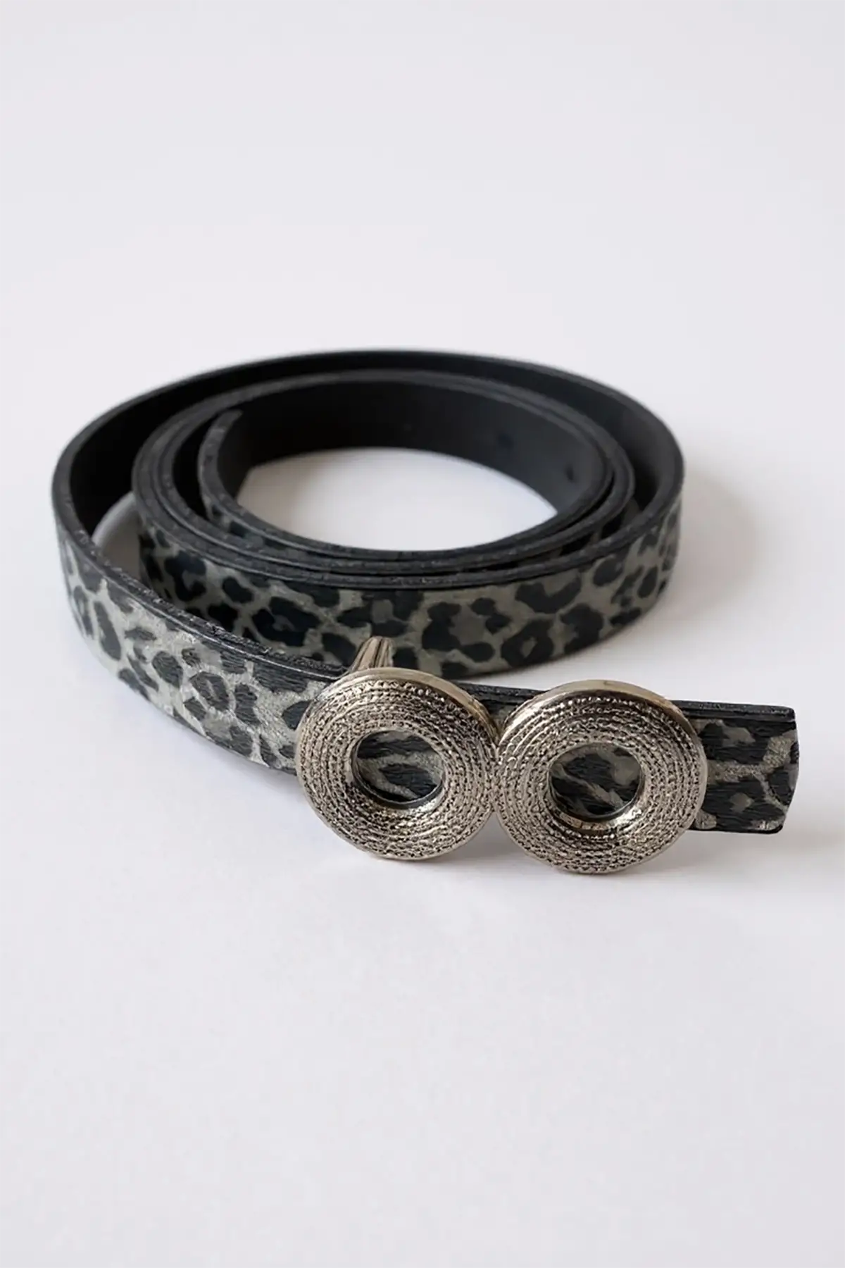 Gümüş Renk Leopar Desenli Kadın Deri Kemer
