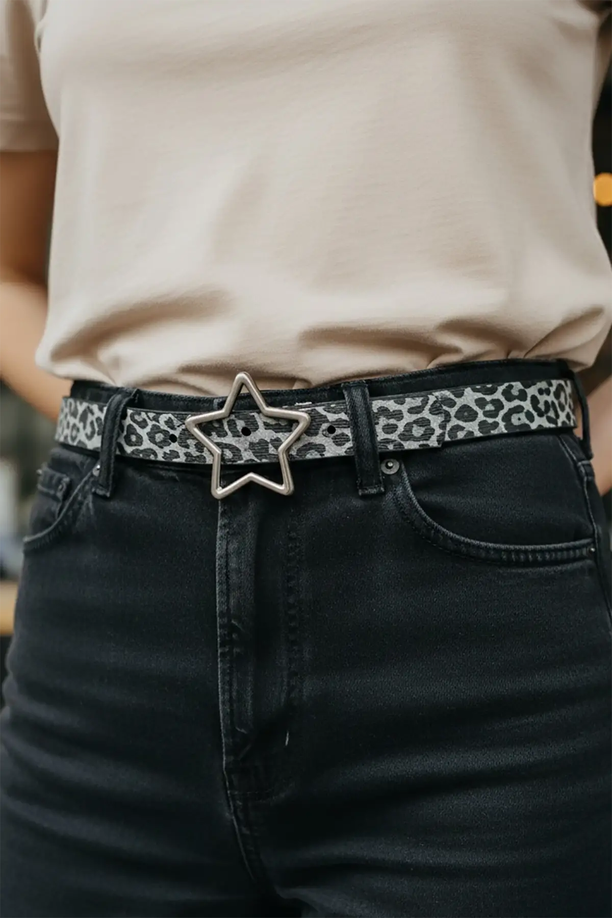 Gümüş Renk Leopar Desenli Kadın Deri Kemer
