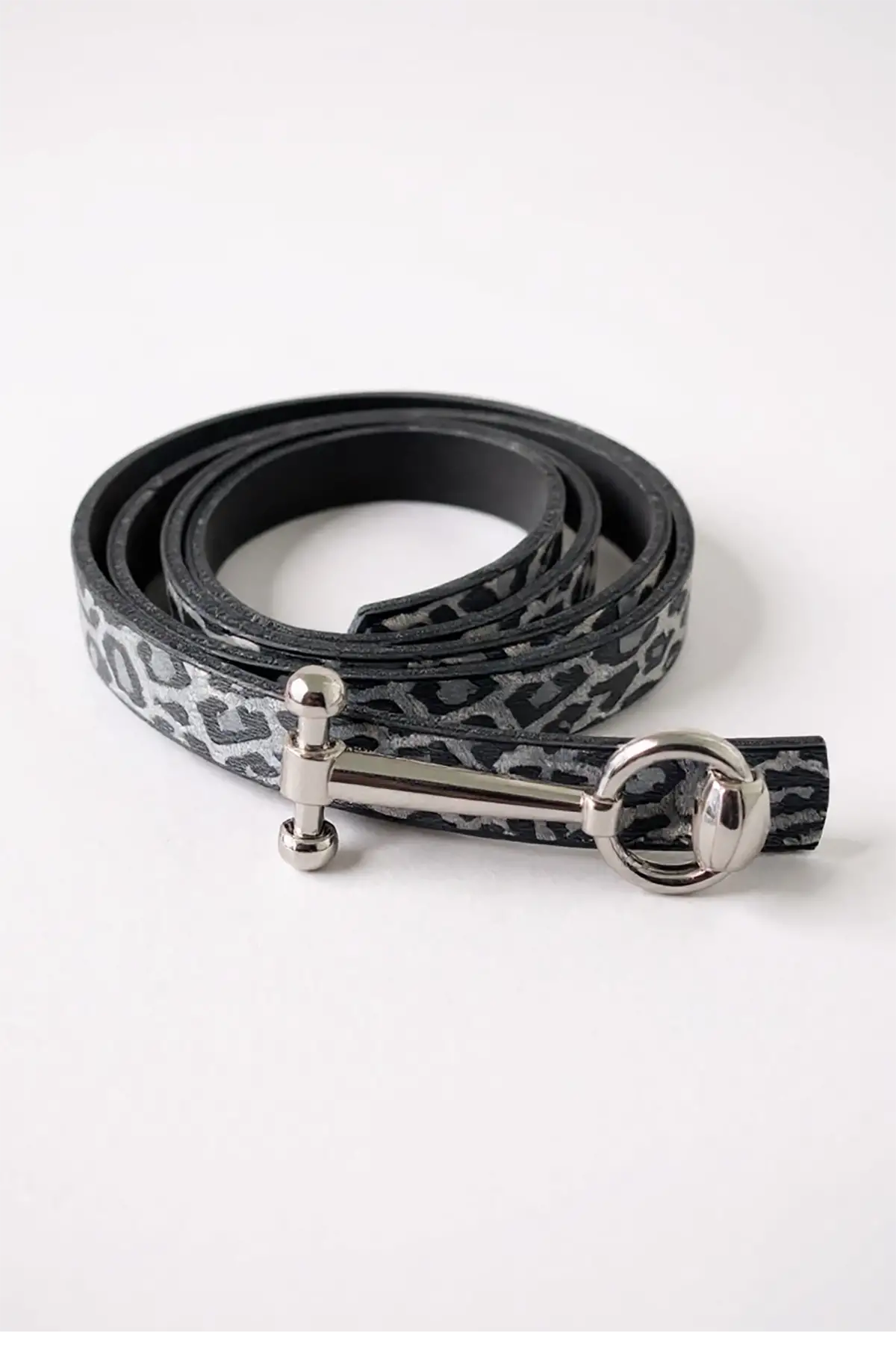 Gümüş Renk Leopar Desenli Kadın Deri Kemer