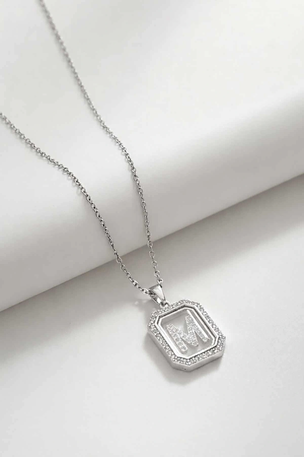 Gümüş Renk M Harf Taş Detaylı Çelik Kolye
