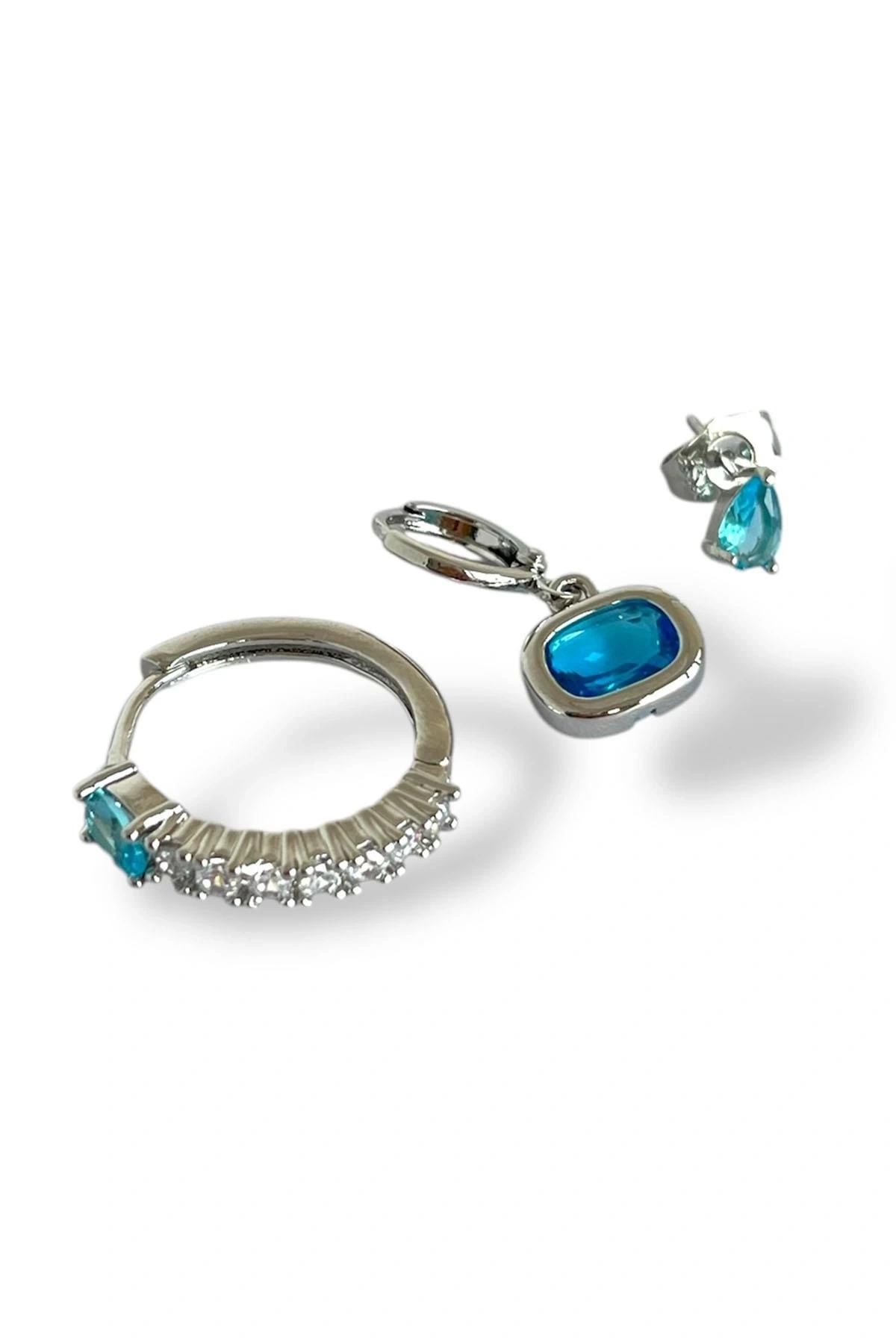 Gümüş Renk Mavi Taş Detaylı 3'lü YSX Küpe Set