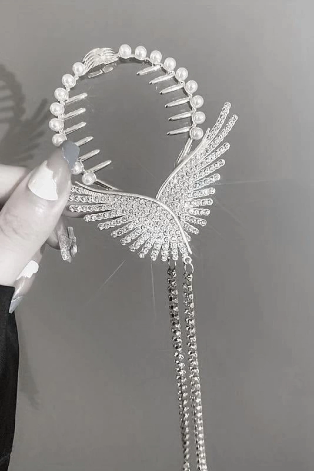 Gümüş Renk Melek Kanadı Figürlü İnci Ve Taş Detaylı Topuz Toka