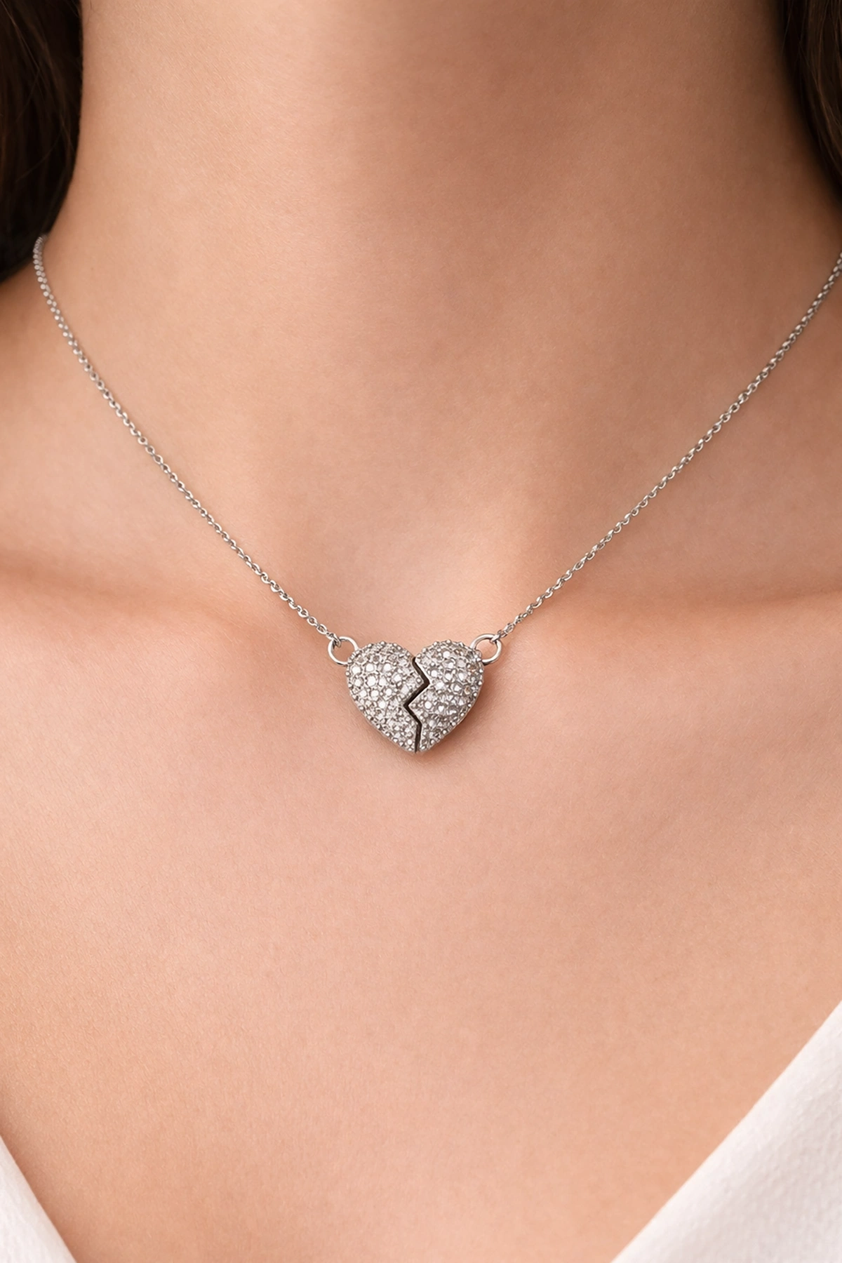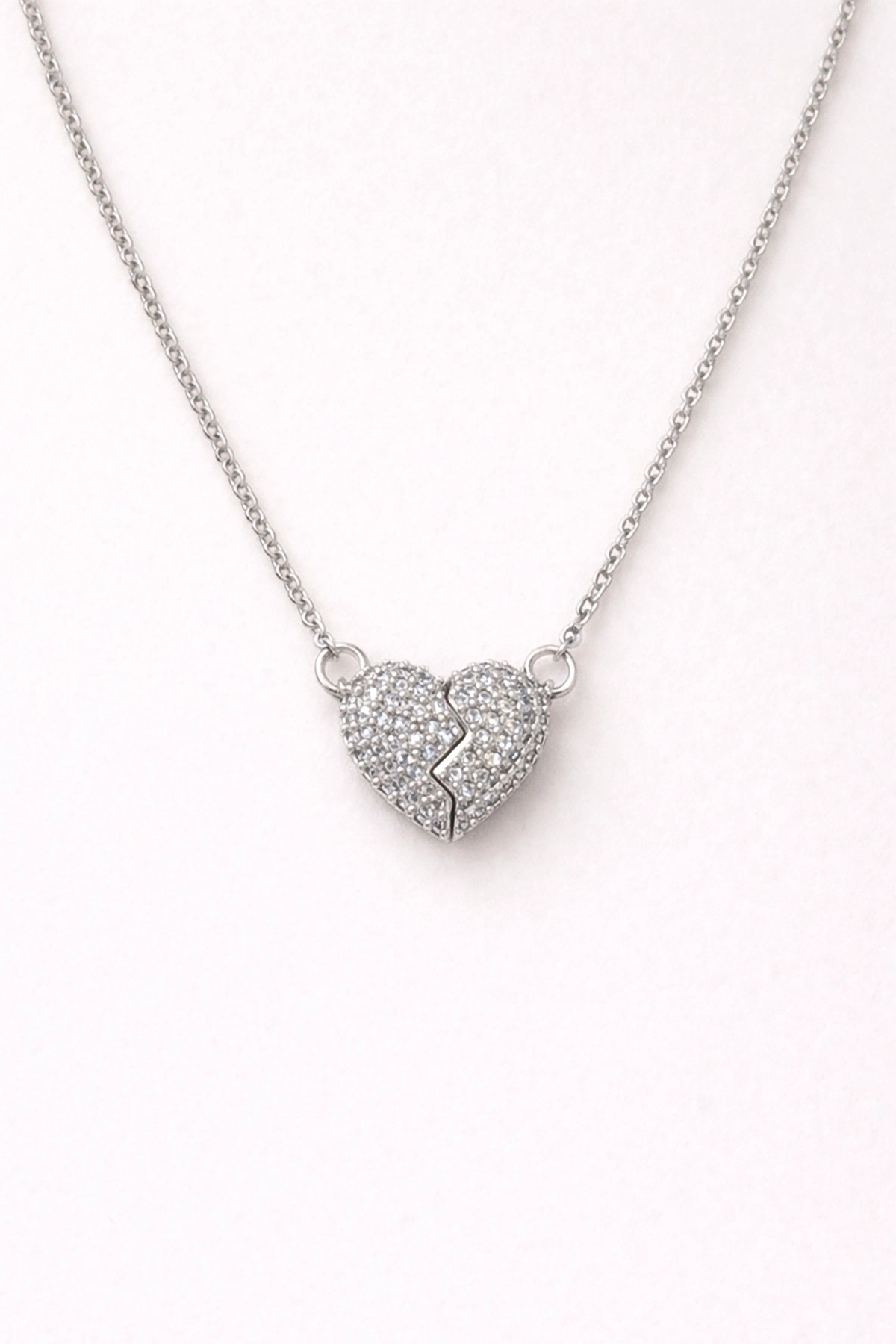Gümüş Renk Mıknatıslı Kalp Figürlü Taşlı Çelik Kolye